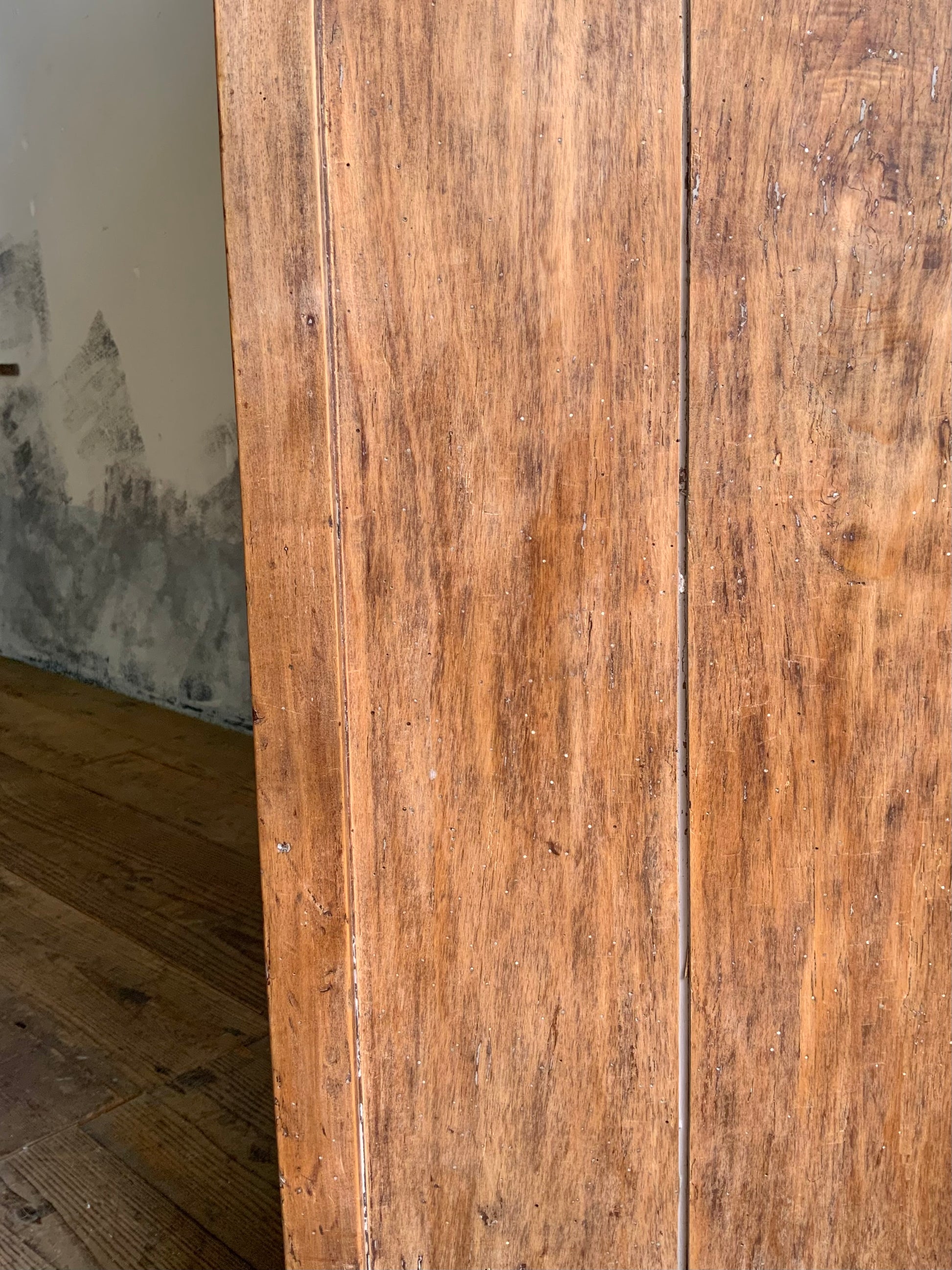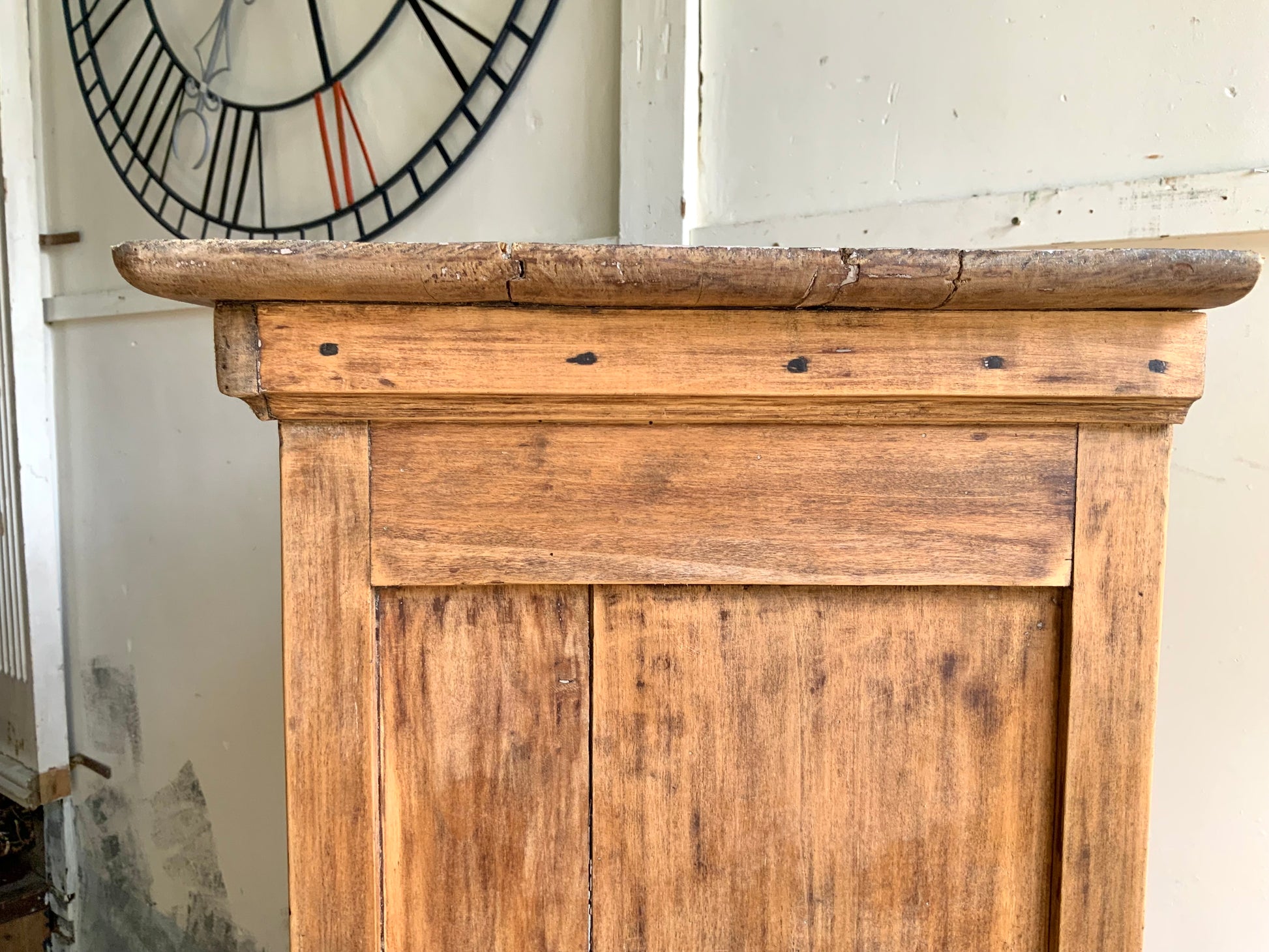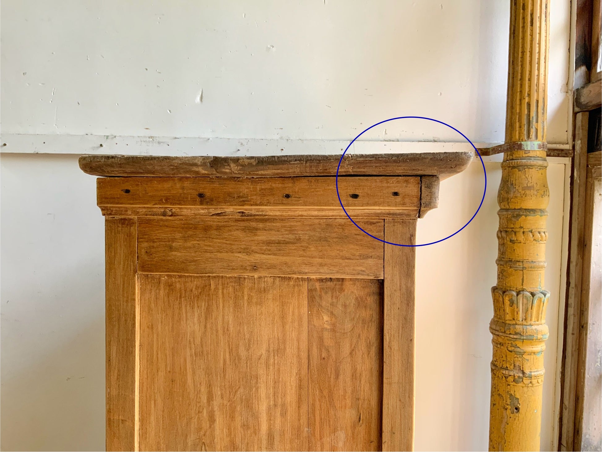 向かって左の天板に少し反りがございます。側面には虫食い跡ございます。詳細写真にてご確認いただけると思います。まだま長くお使いいただける家具です、おすすめです。