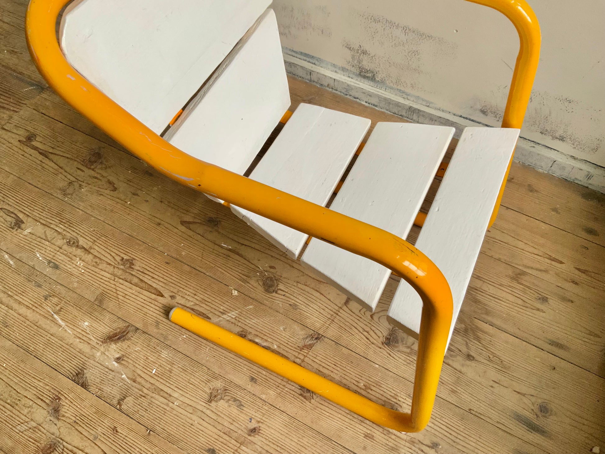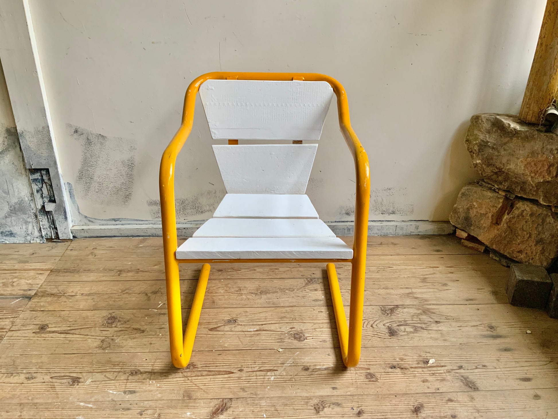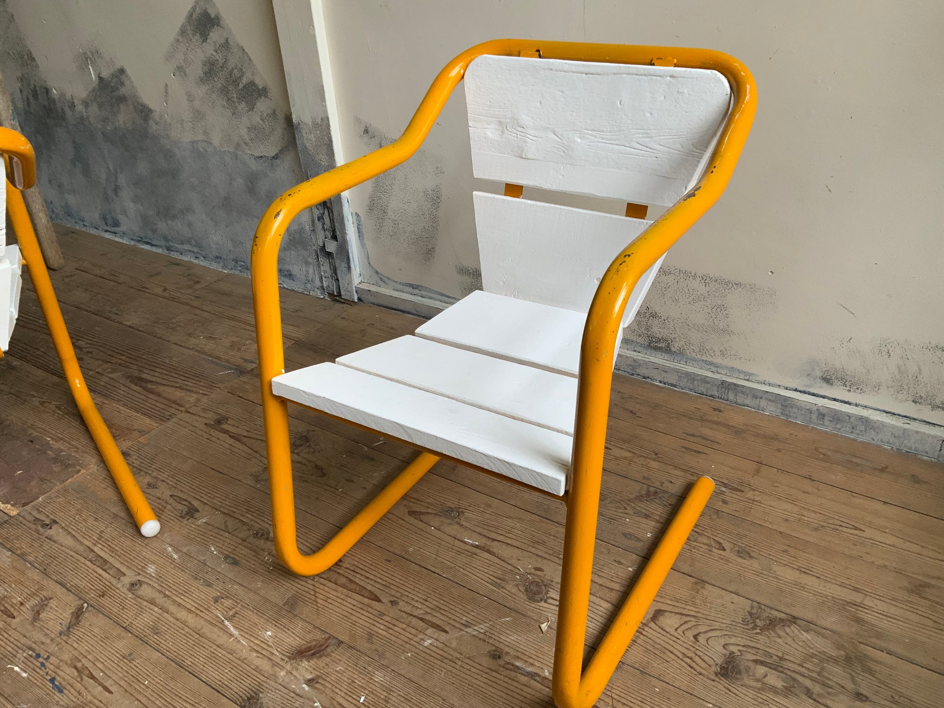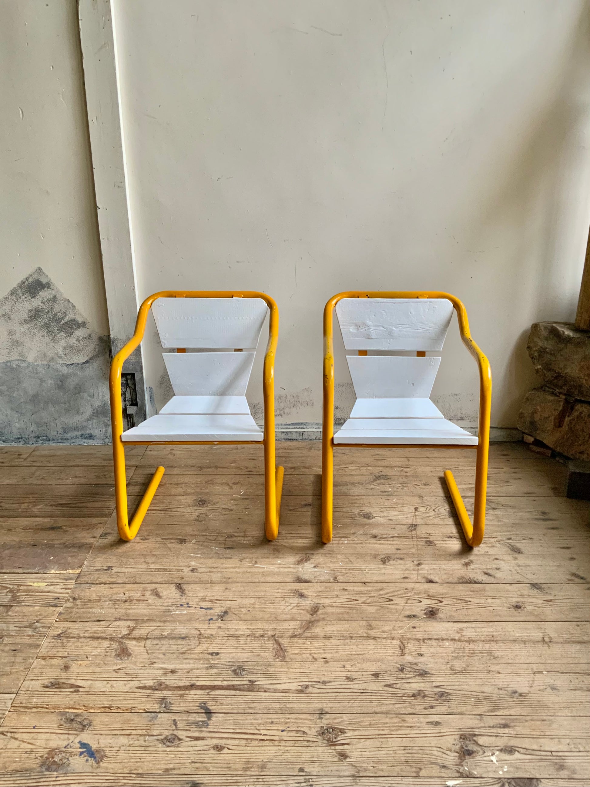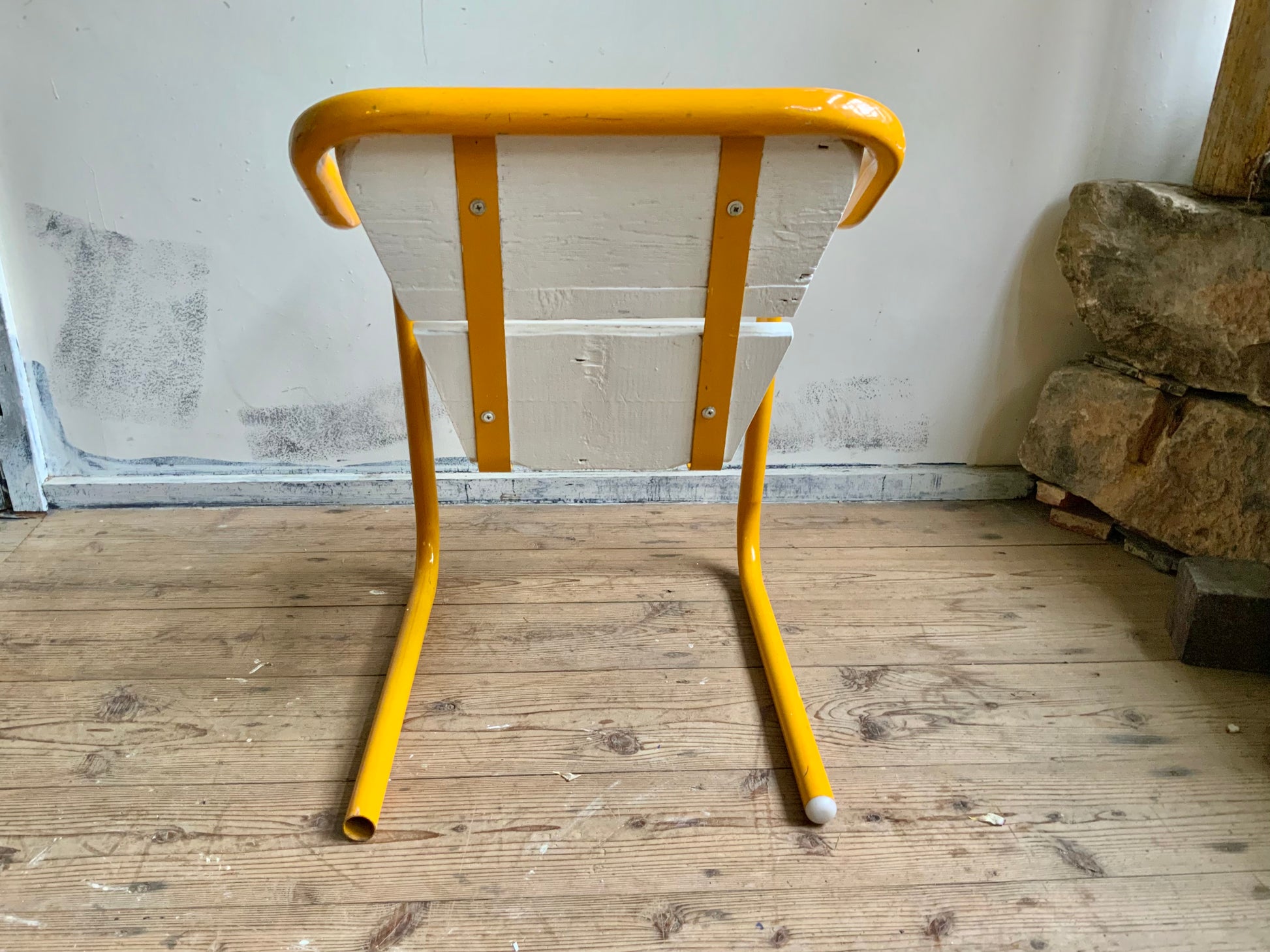 モダンなパイプチェアのご紹介。シートのかたちがdecoっぽくもあり、洒落た雰囲気です。座面は木製+ペイント仕上げ。クラシックなものとのミックス使いもおすすめ。