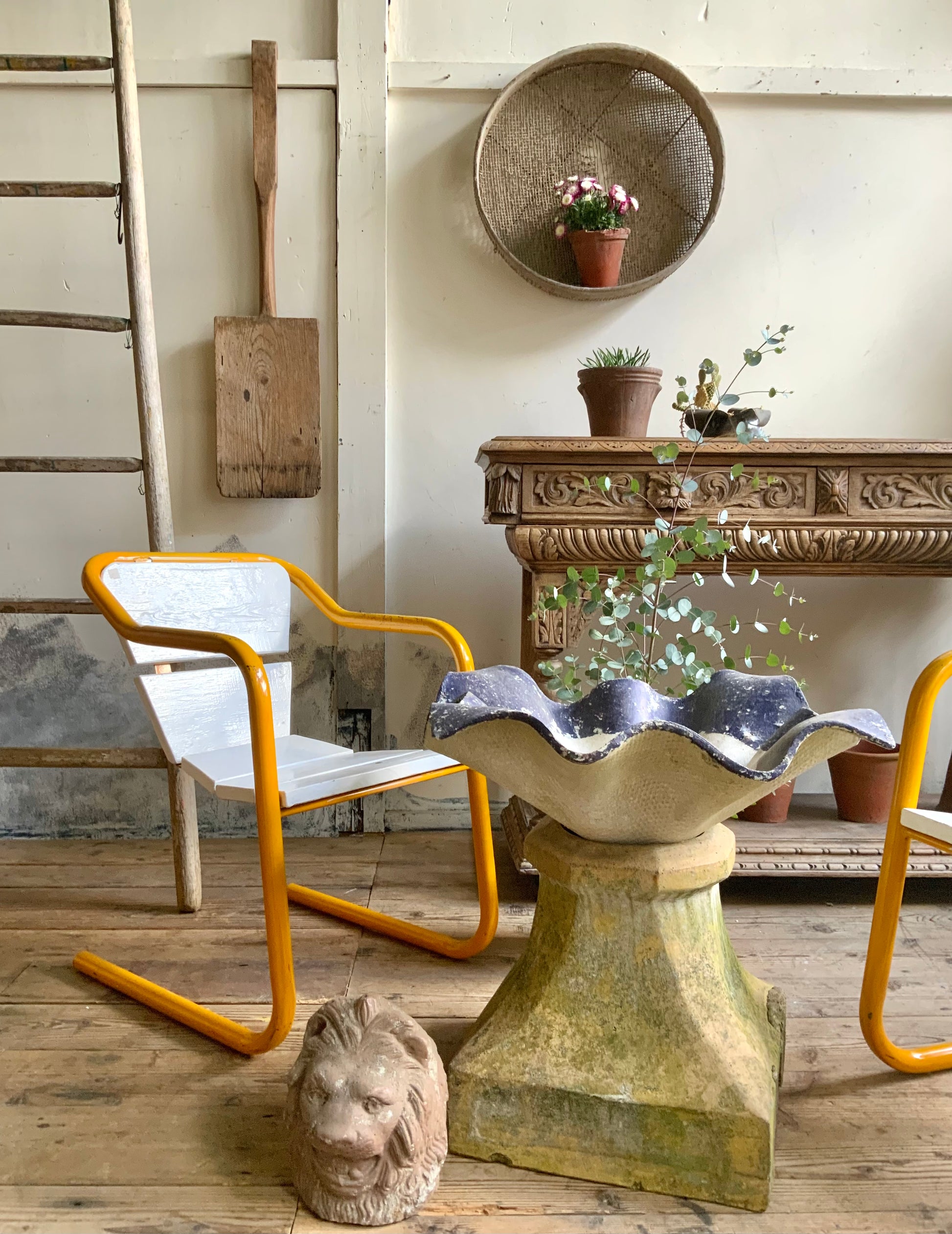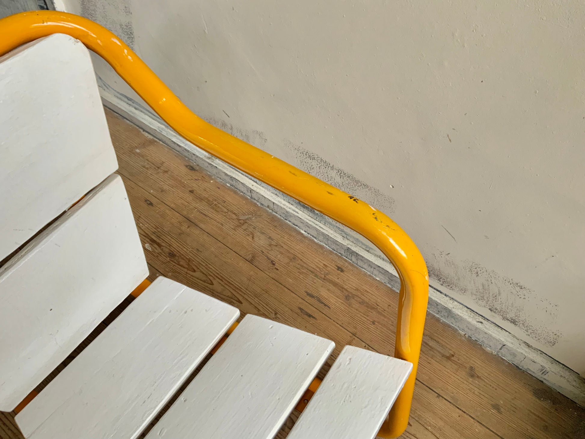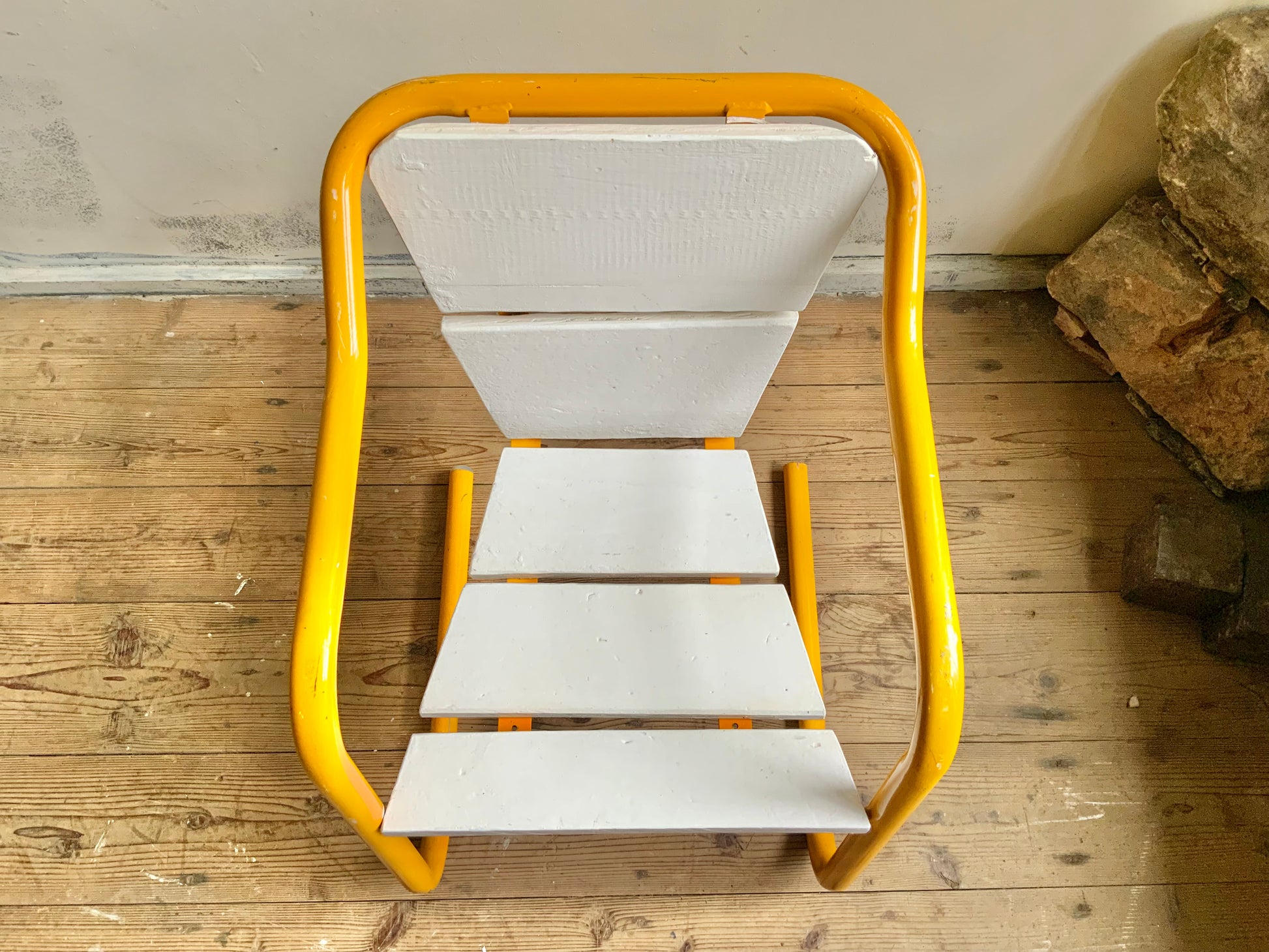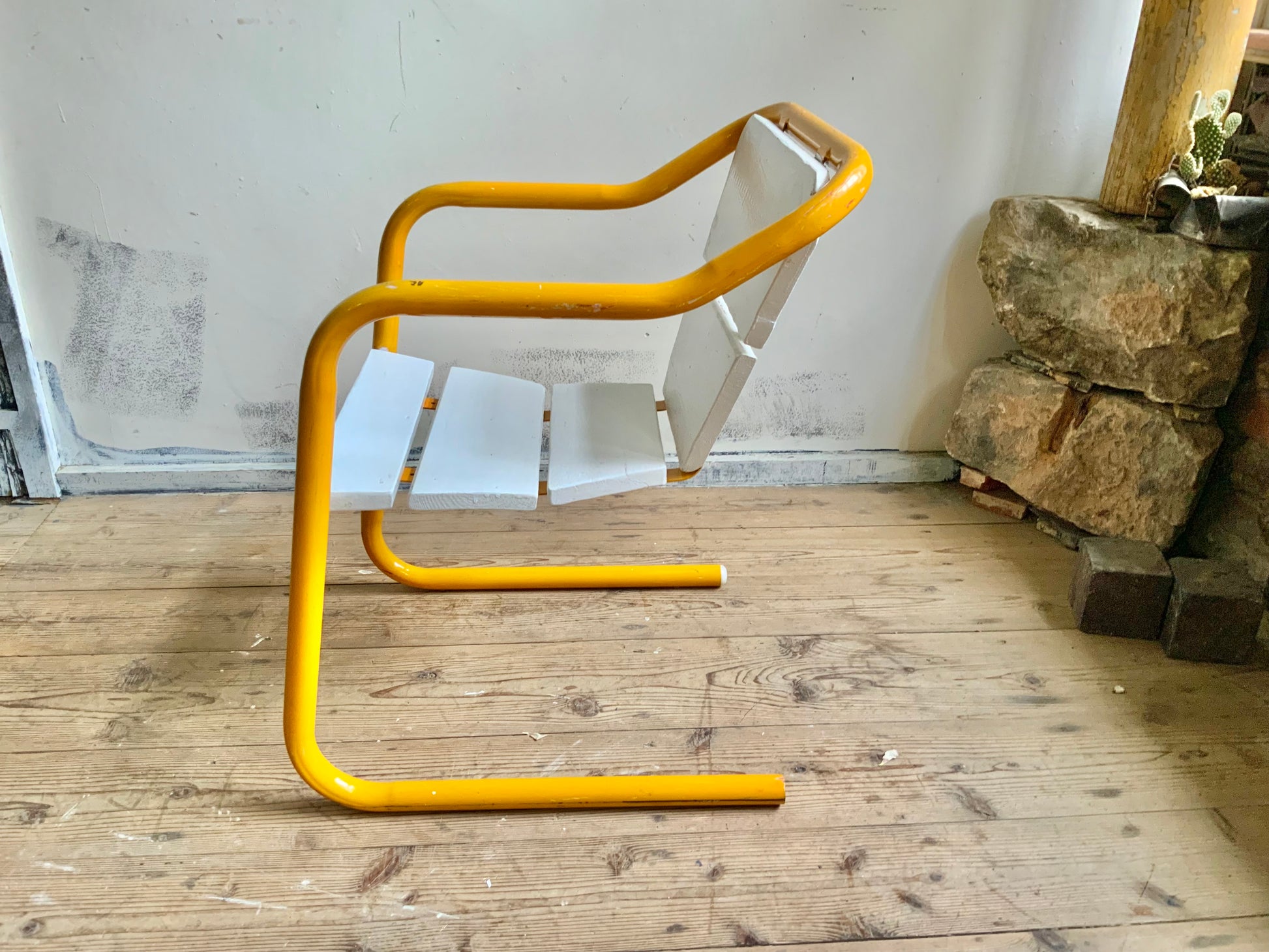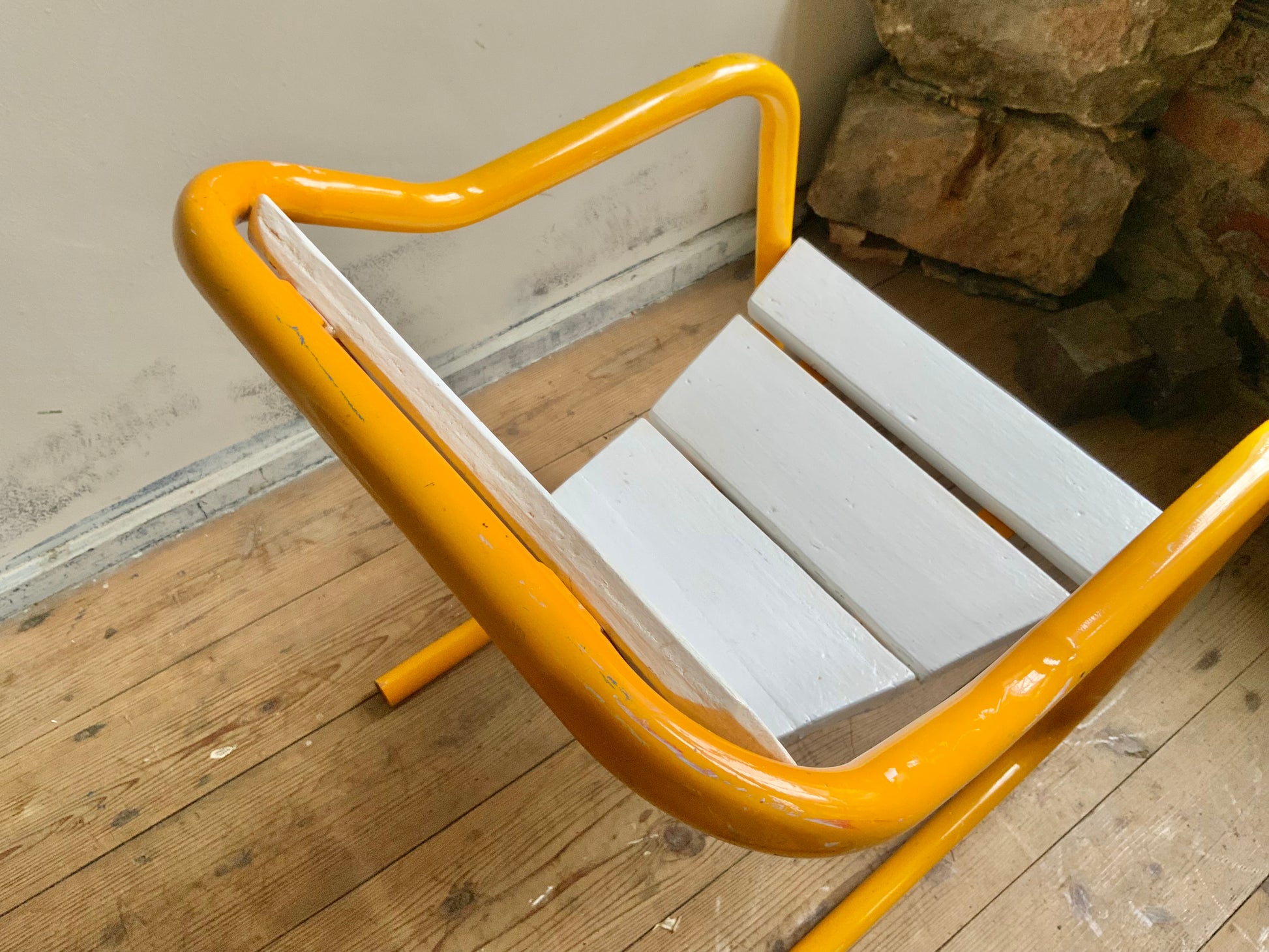 モダンなパイプチェアのご紹介。シートのかたちがdecoっぽくもあり、洒落た雰囲気です。座面は木製+ペイント仕上げ。クラシックなものとのミックス使いもおすすめ。