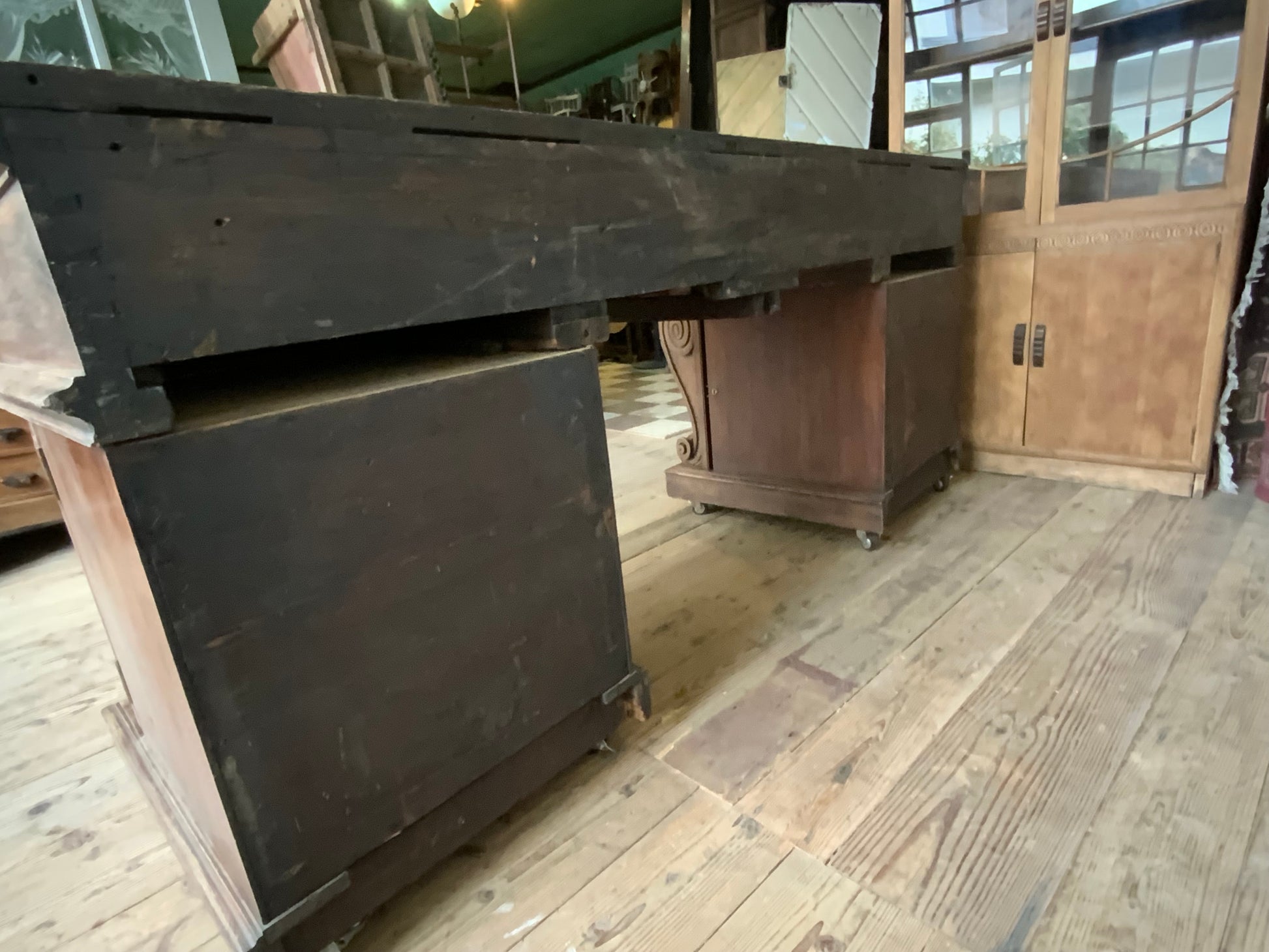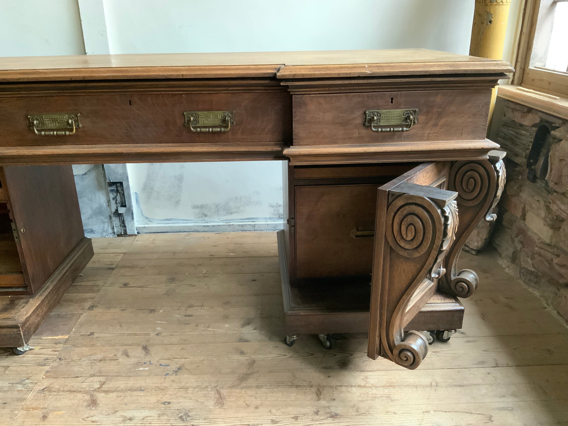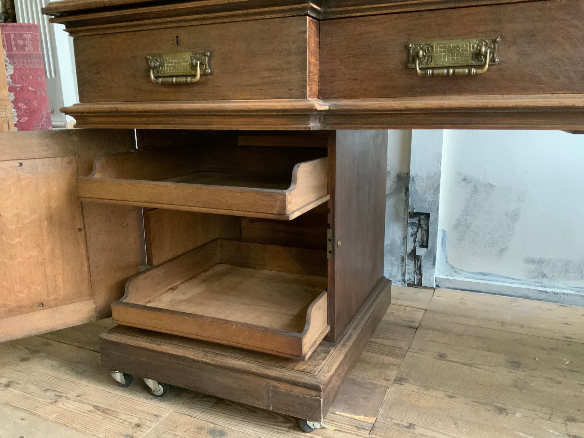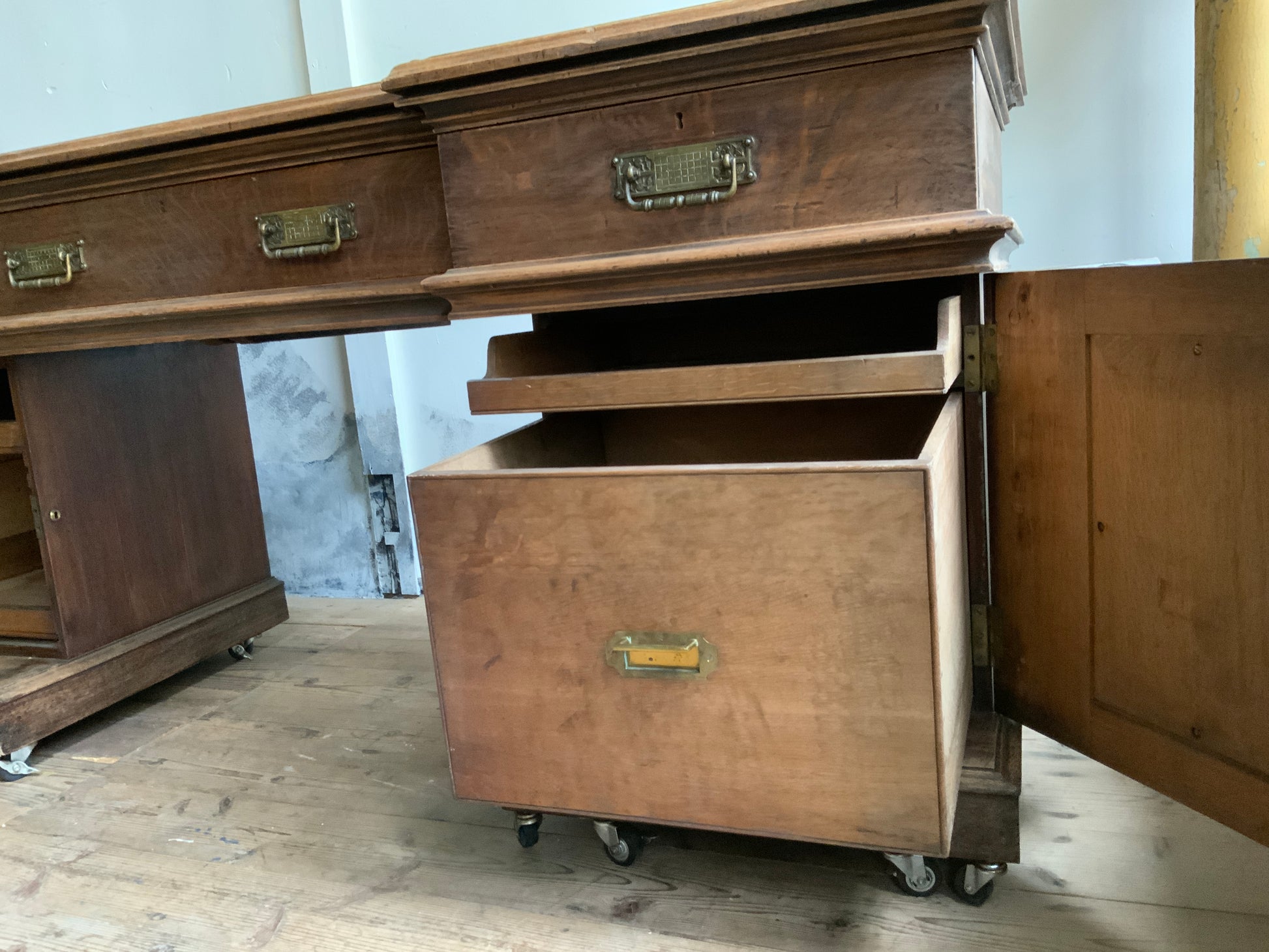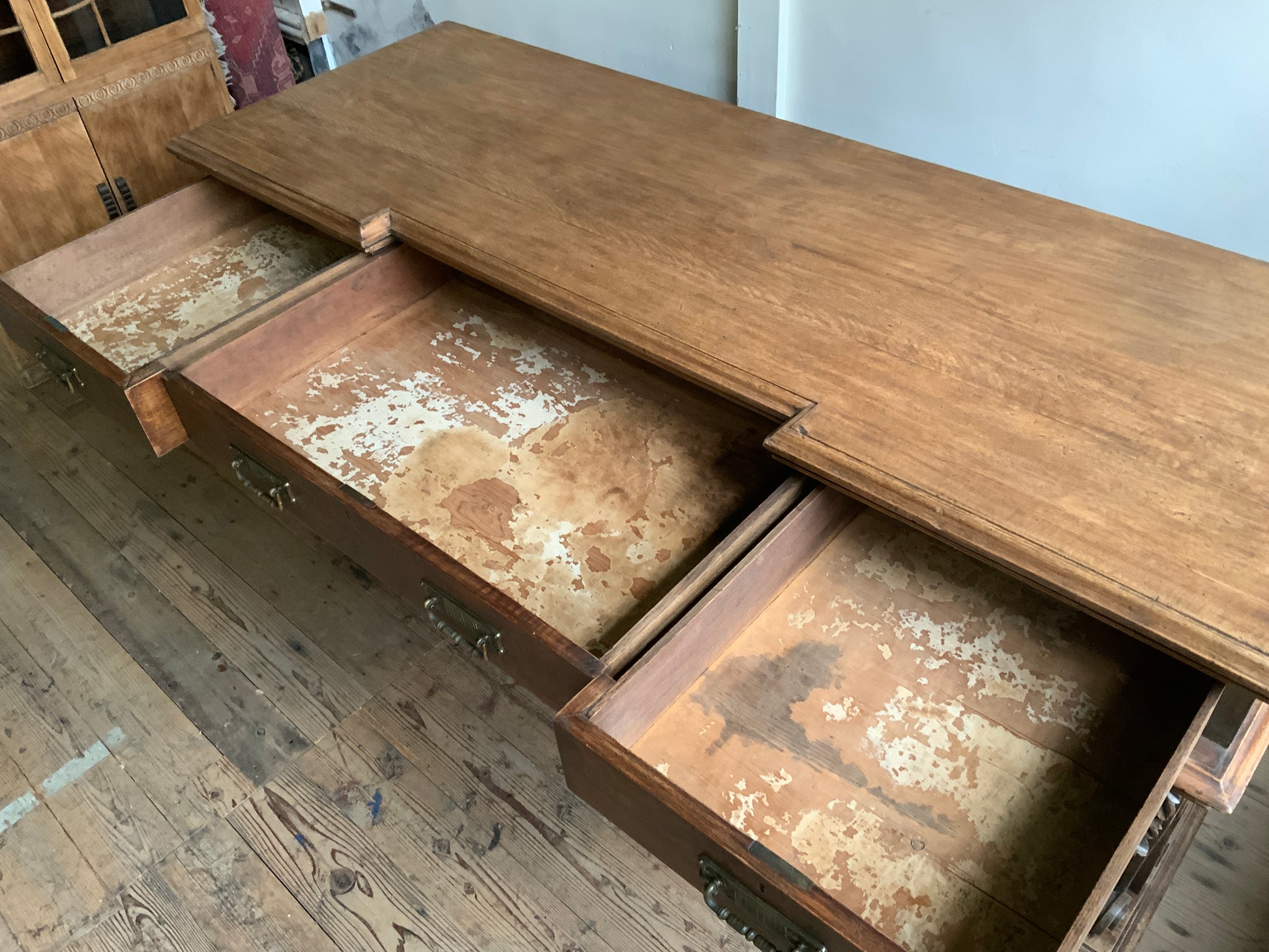 両サイドのキャビネットと引き出し部分と一体となった天板との3点に分解できる造りです。