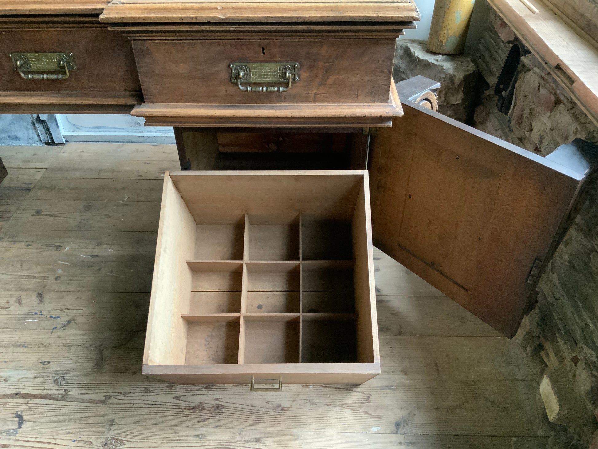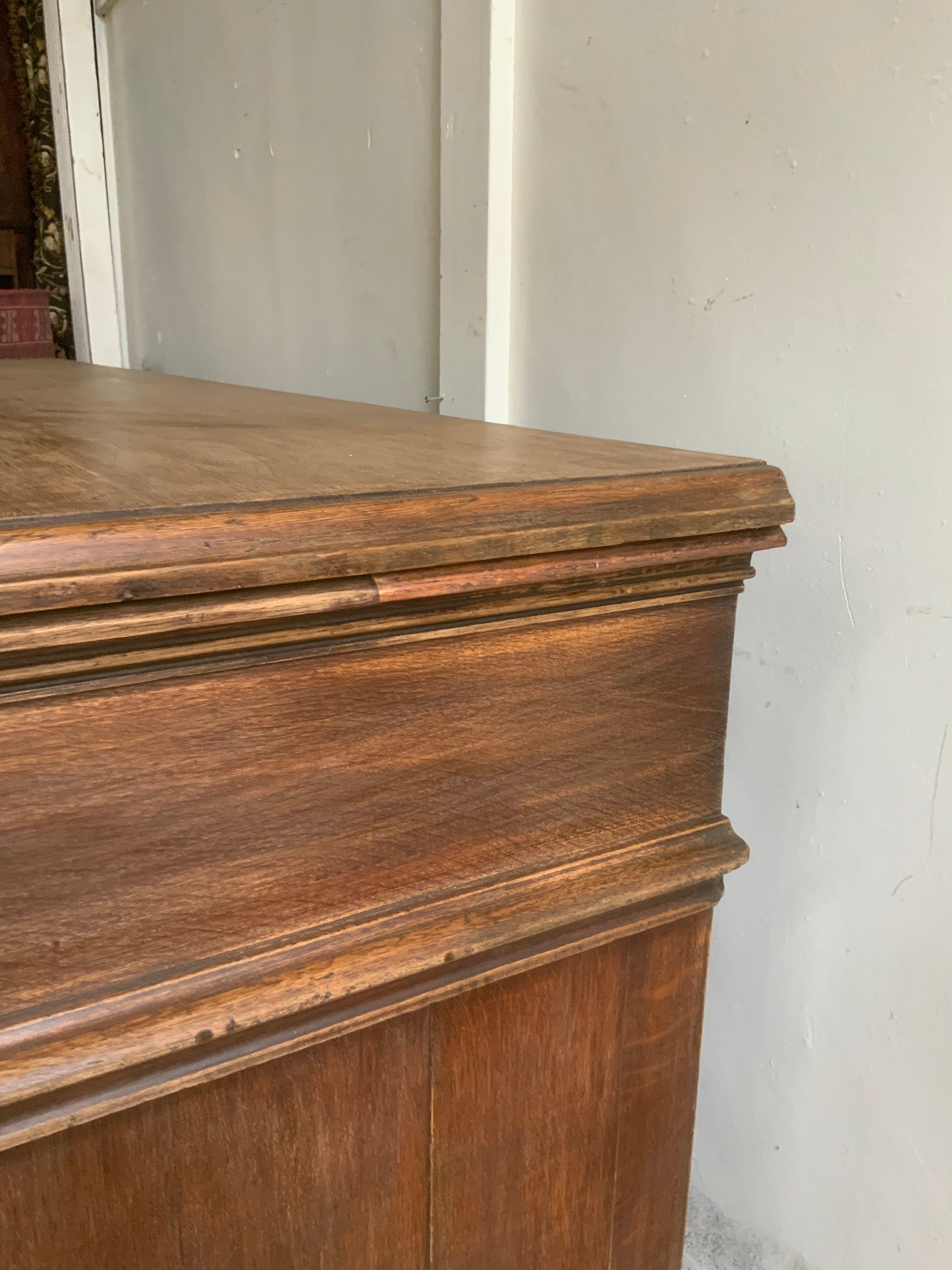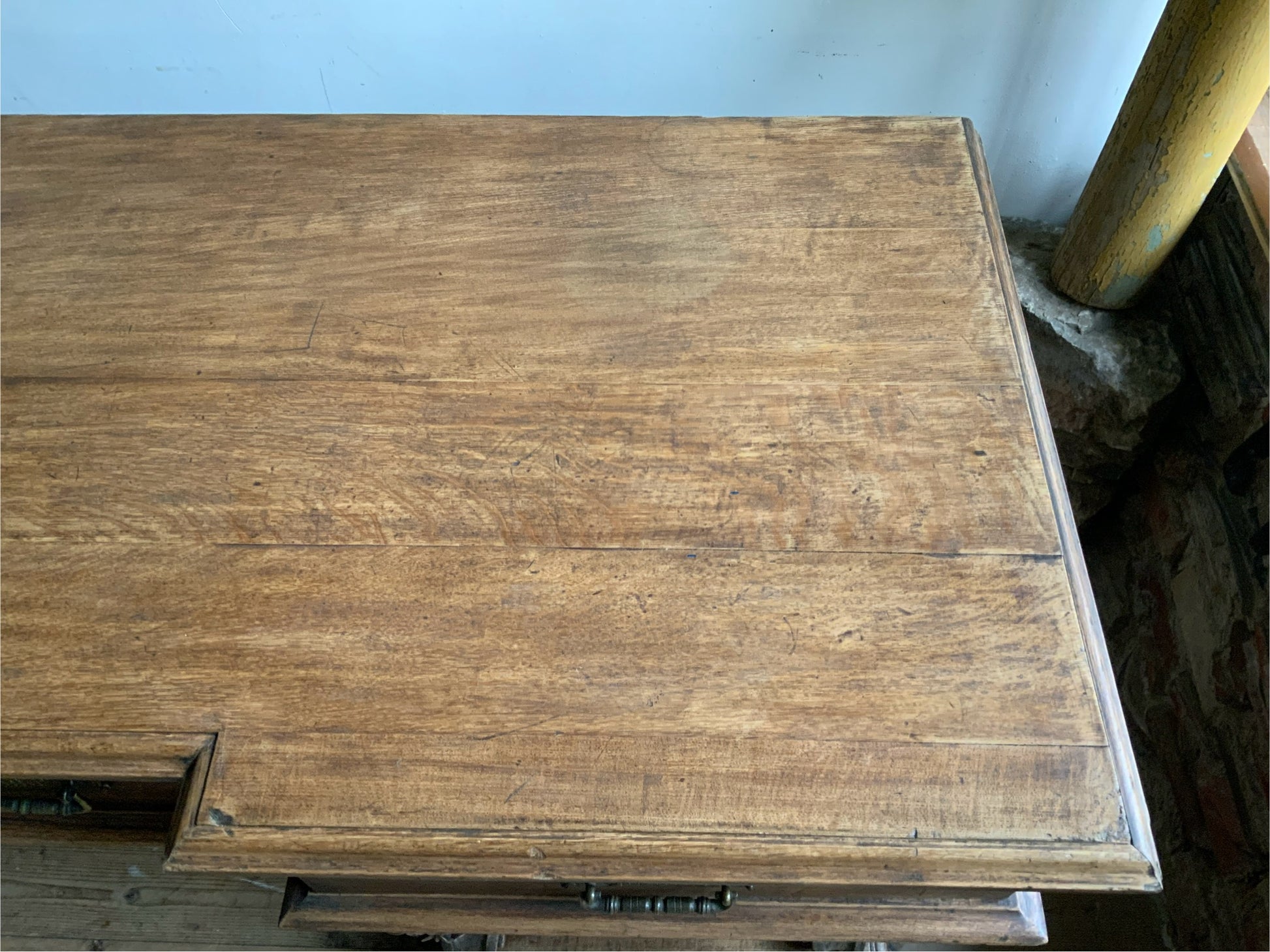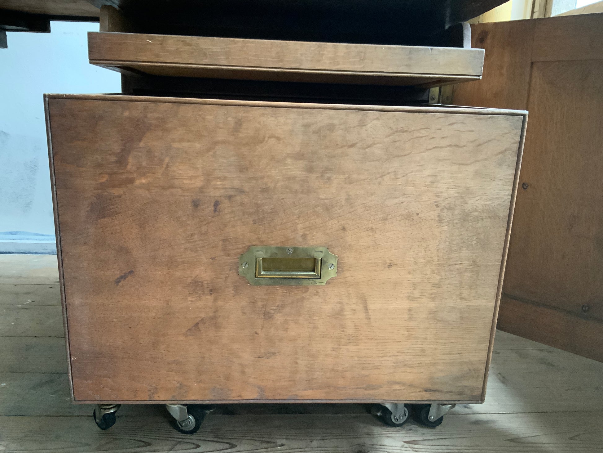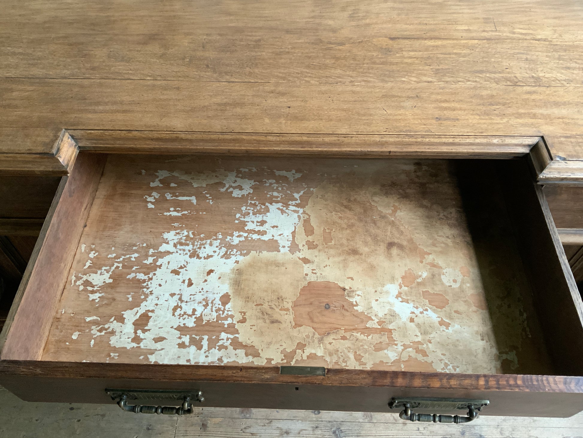 両サイドのキャビネットと引き出し部分と一体となった天板との3点に分解できる造りです。
