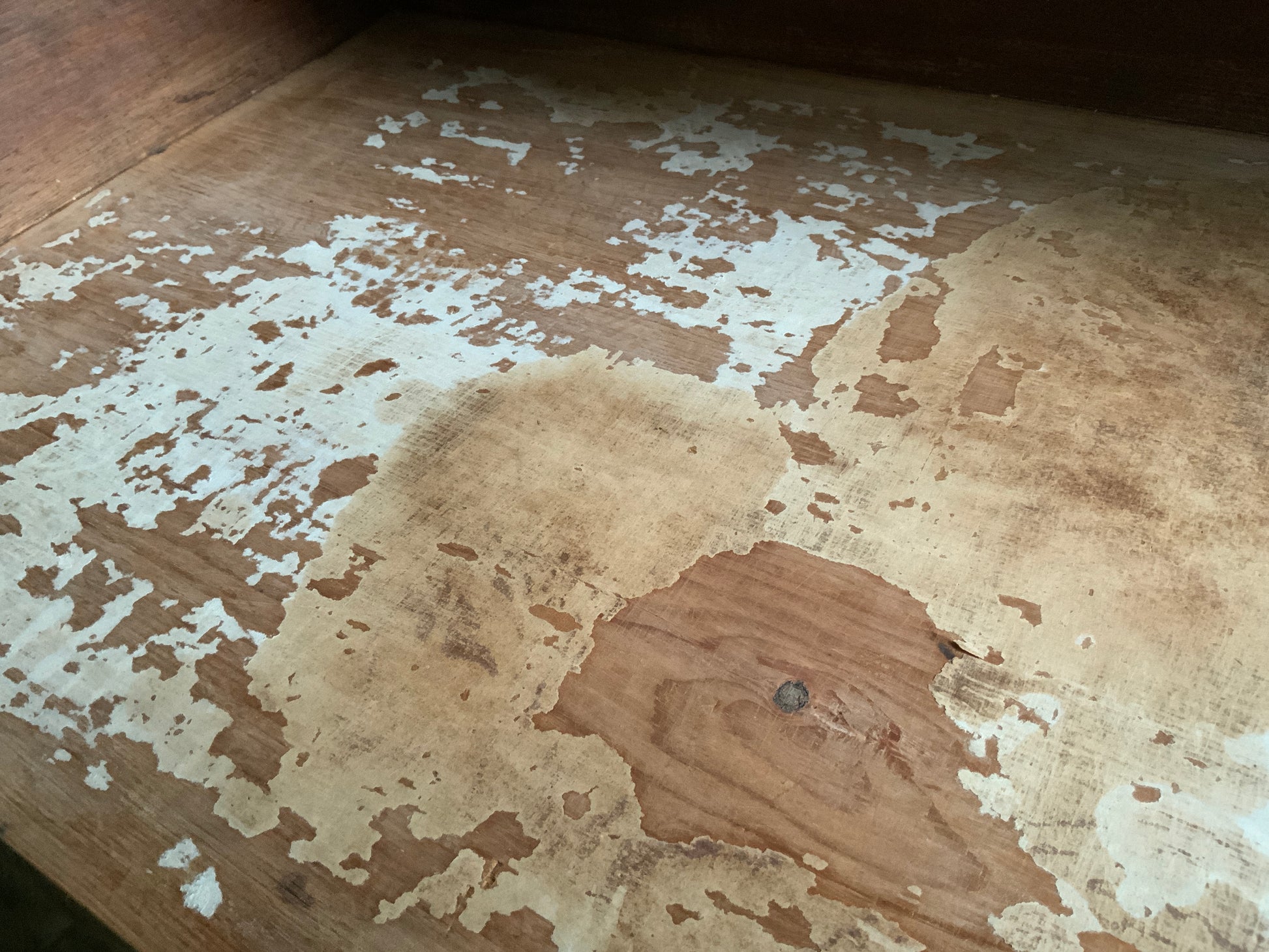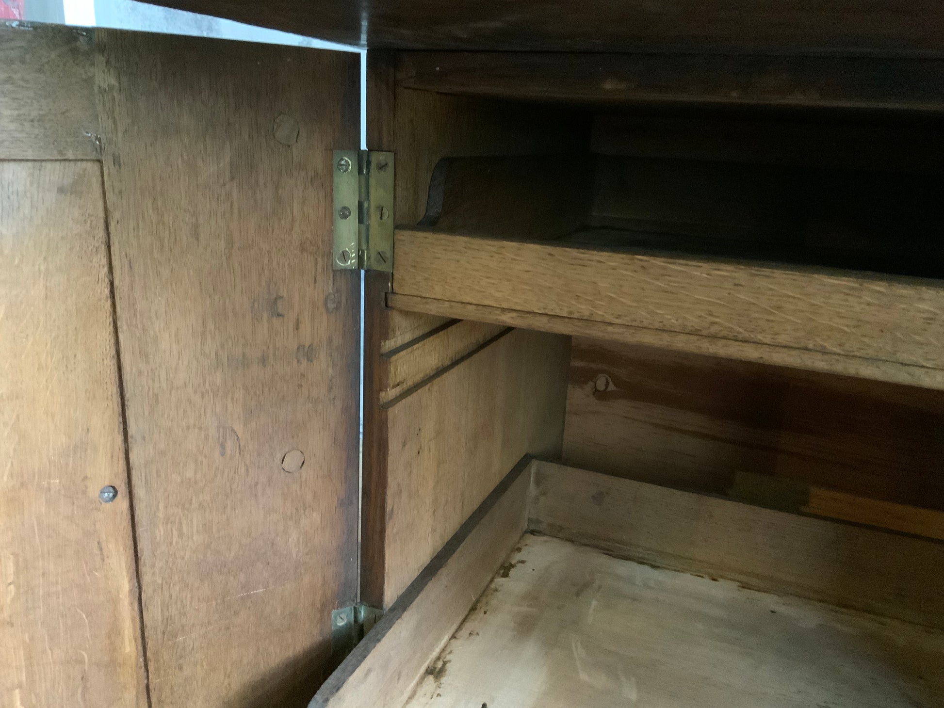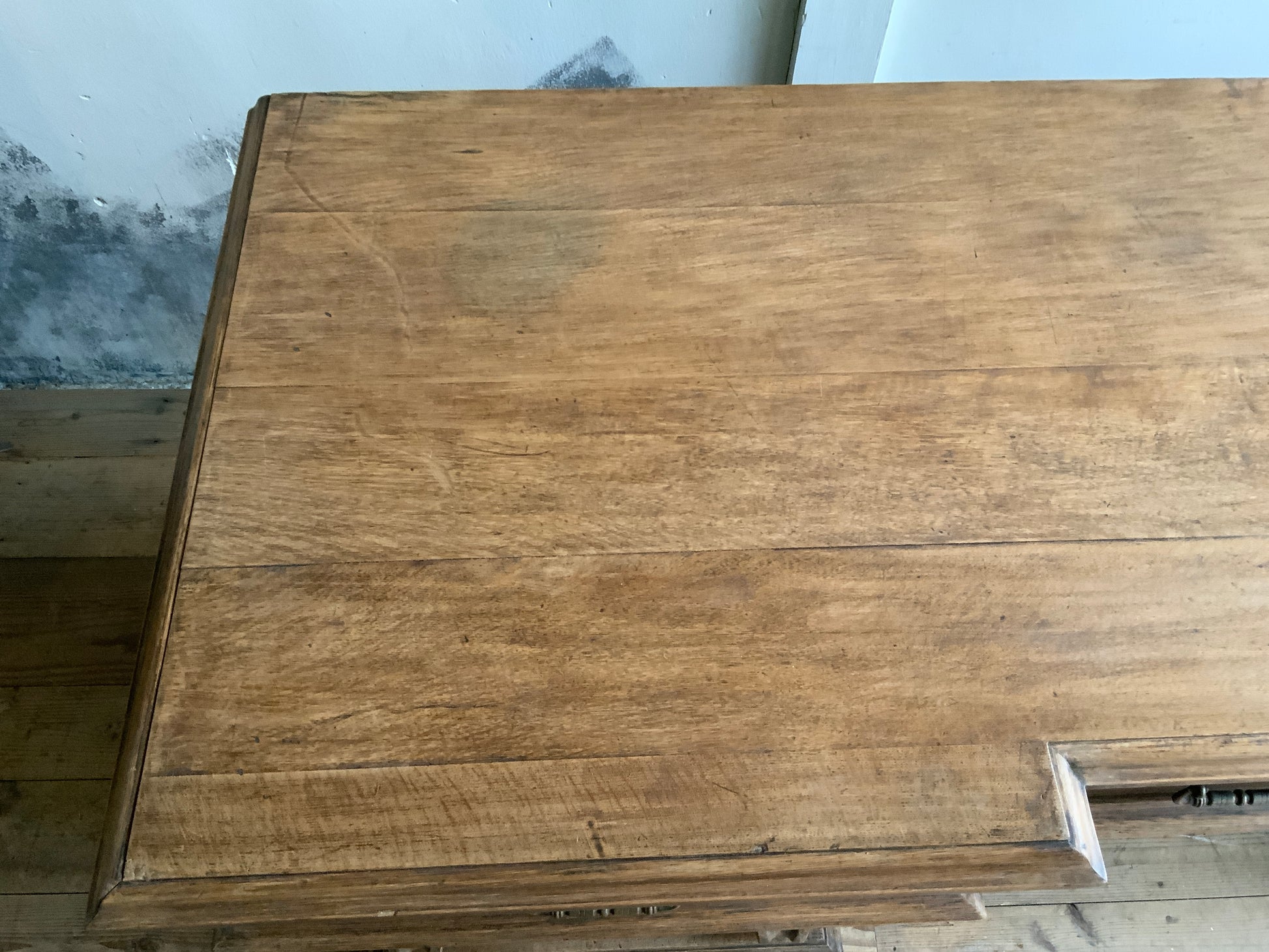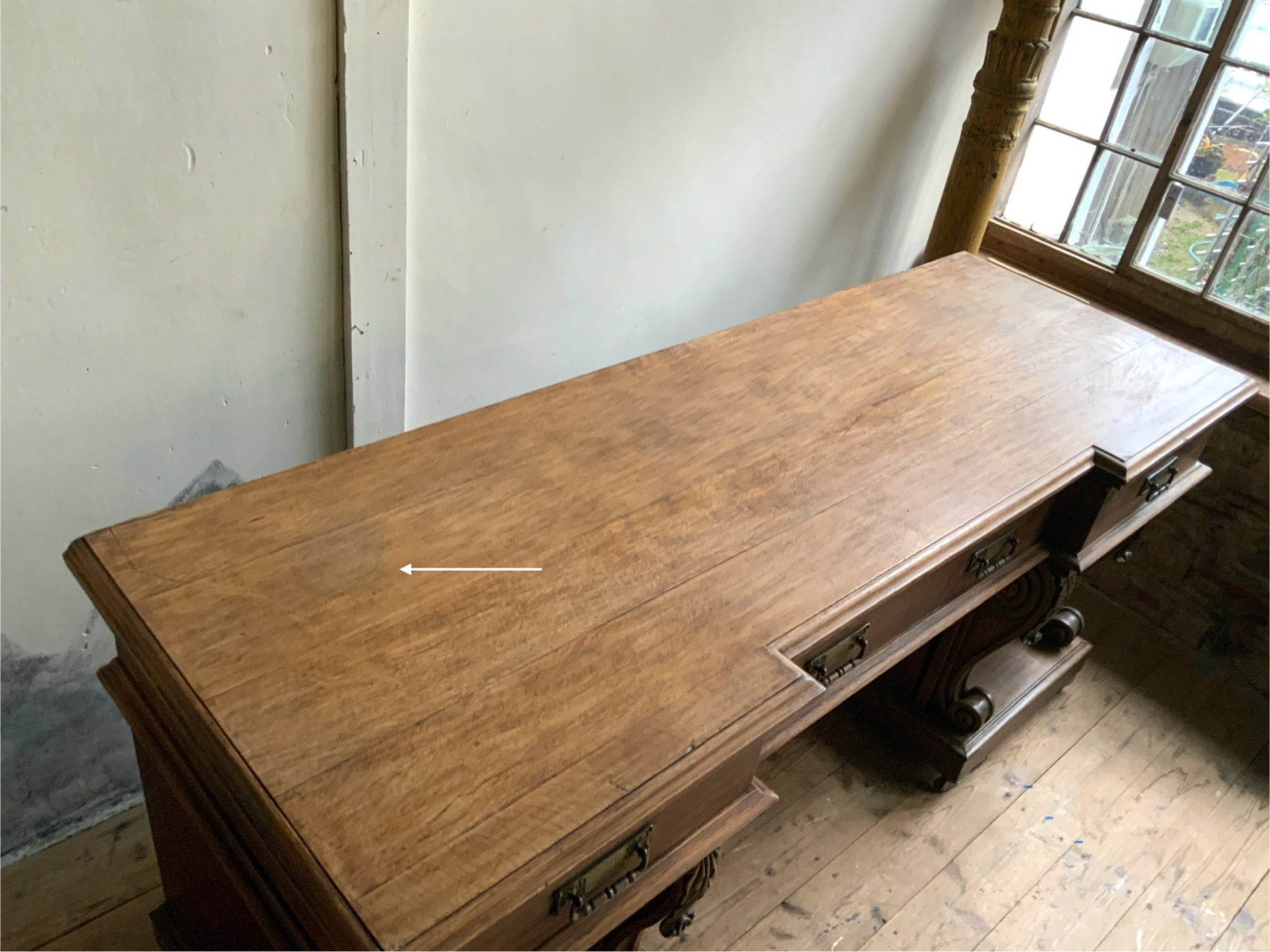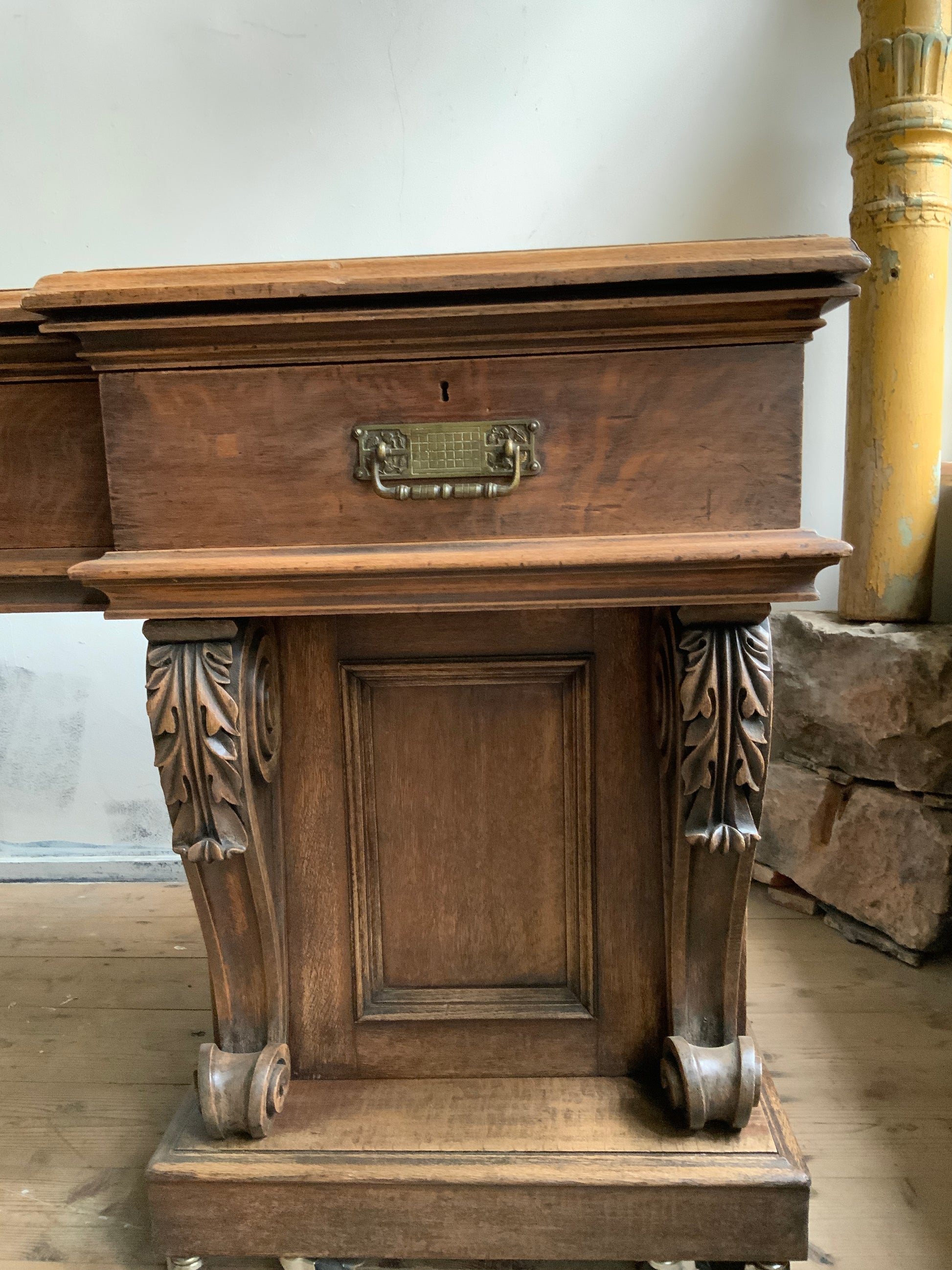 両サイドのキャビネットと引き出し部分と一体となった天板との3点に分解できる造りです。