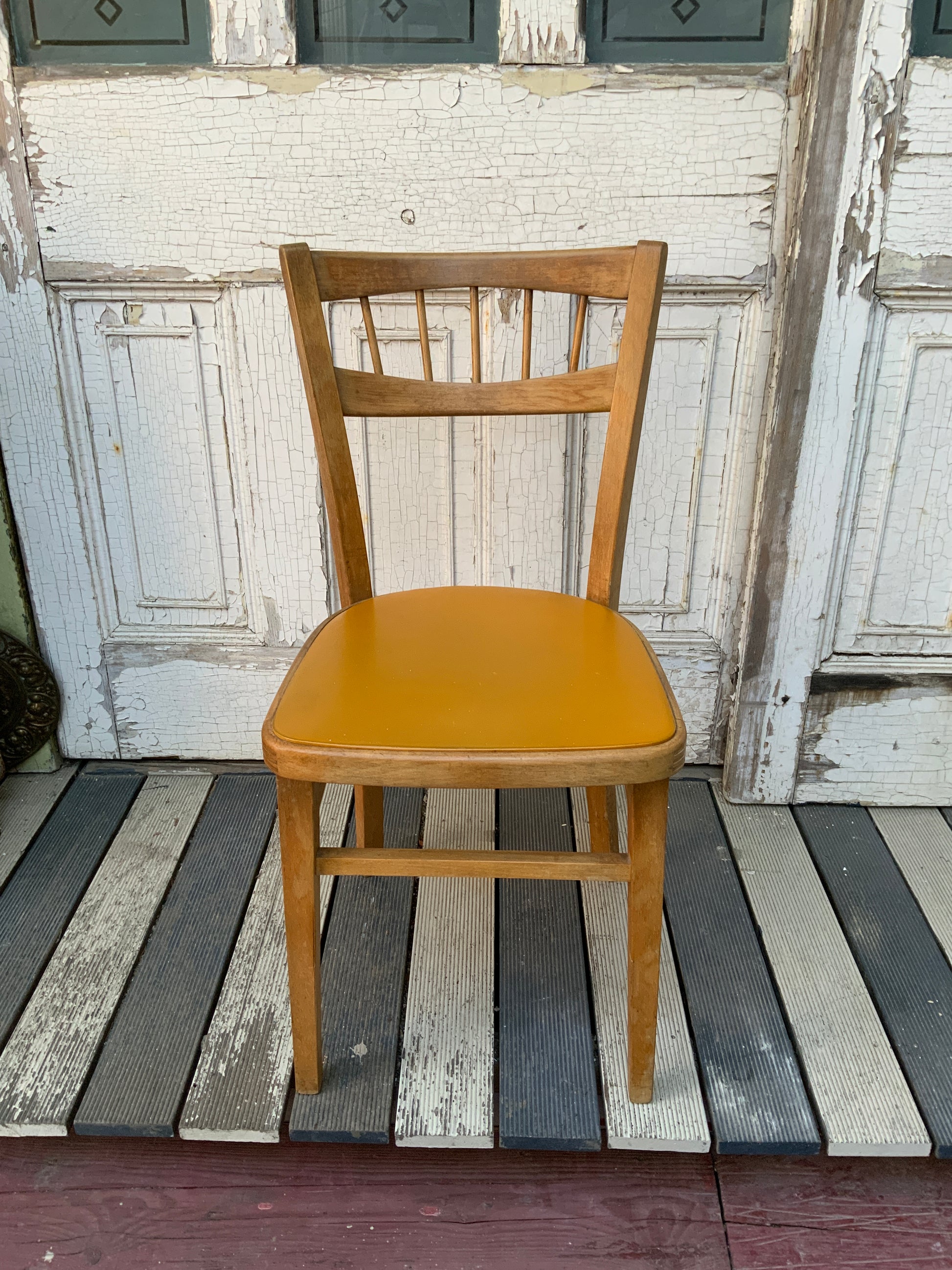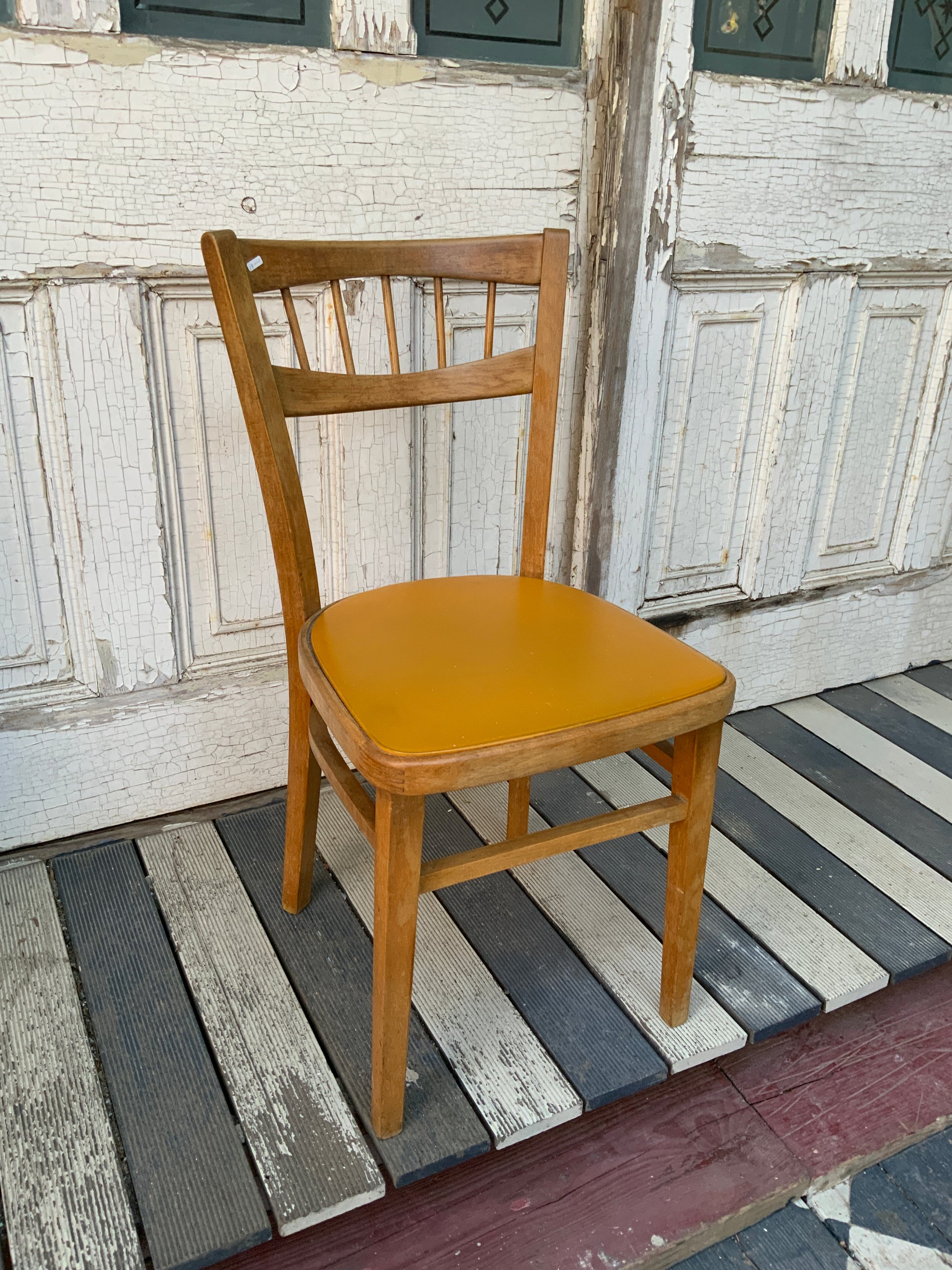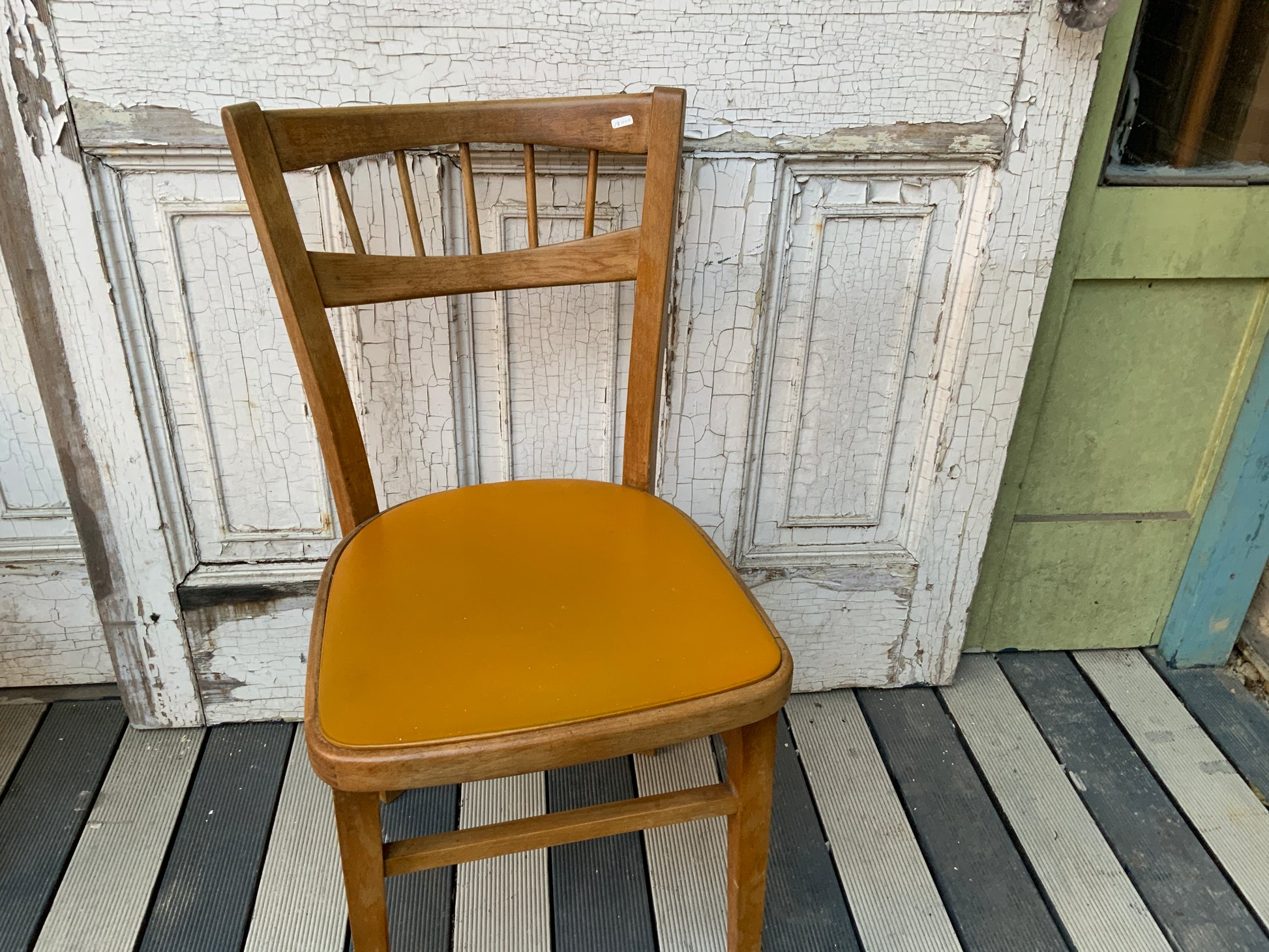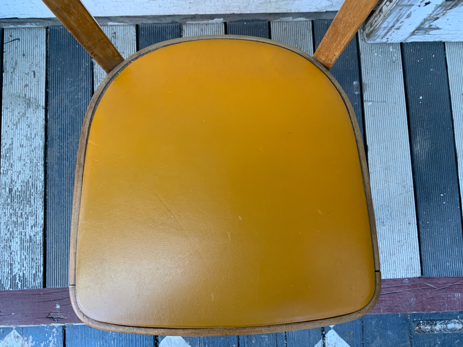 座面はフェイクレザーです、お色や控えめながらバランスの良いデザインで、レトロ感のある素敵なチェアー。お好きなファブリックでクッションを添えても♪