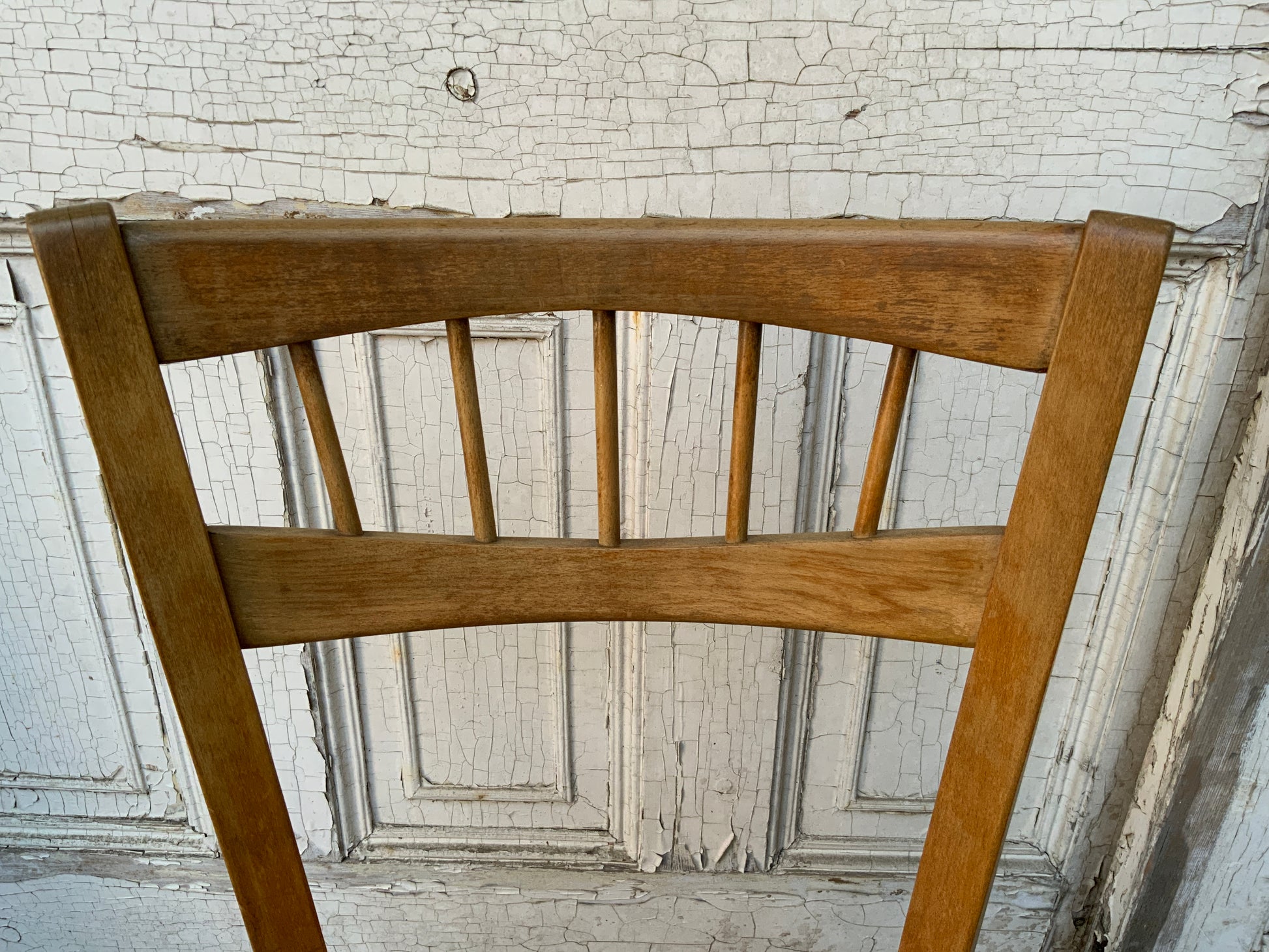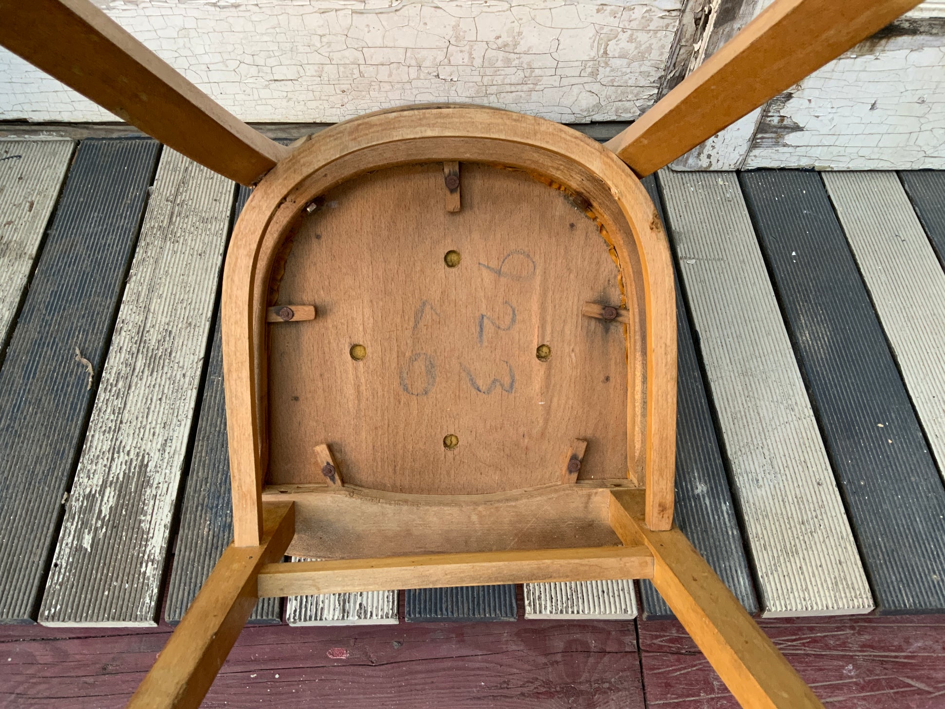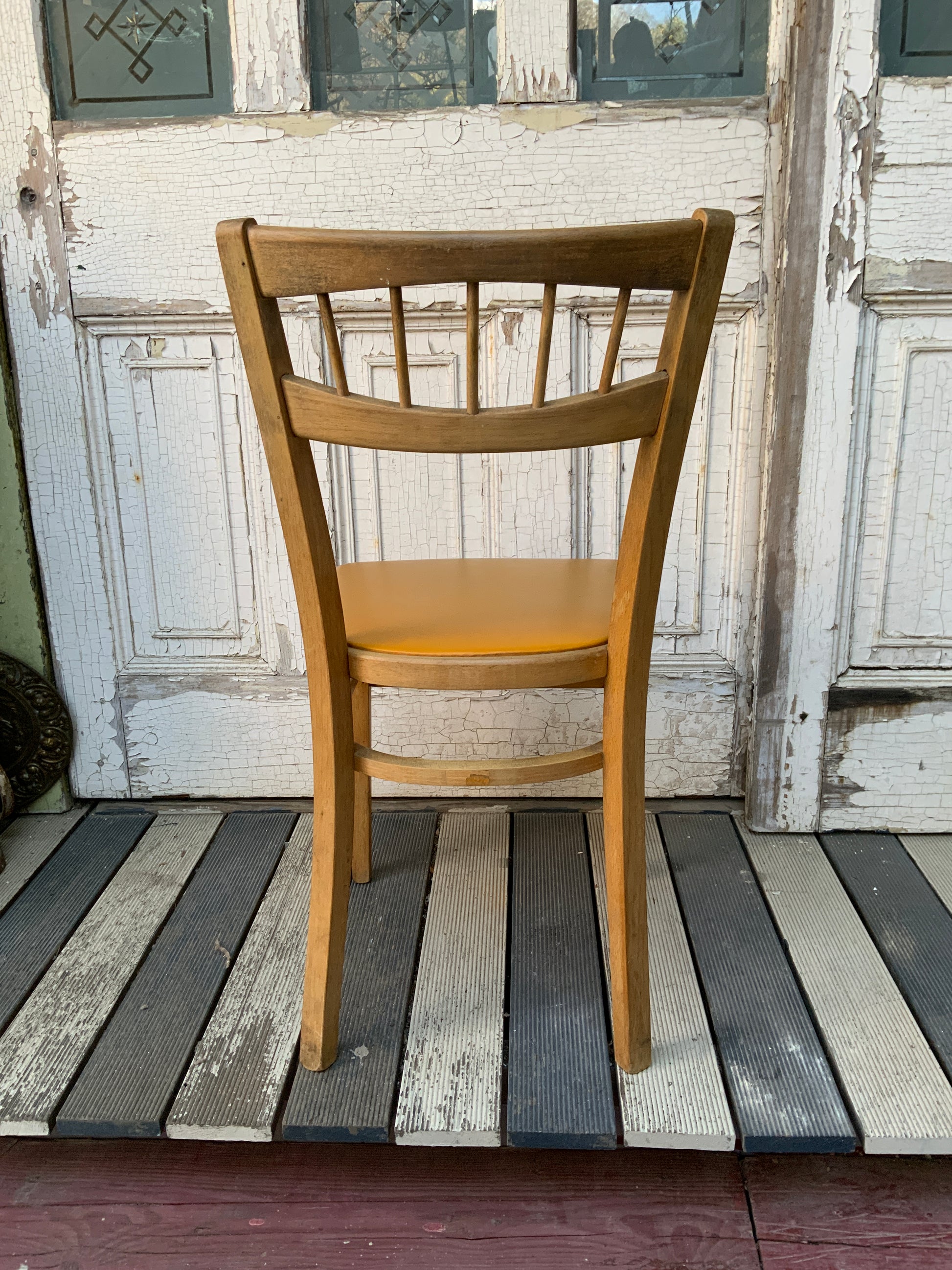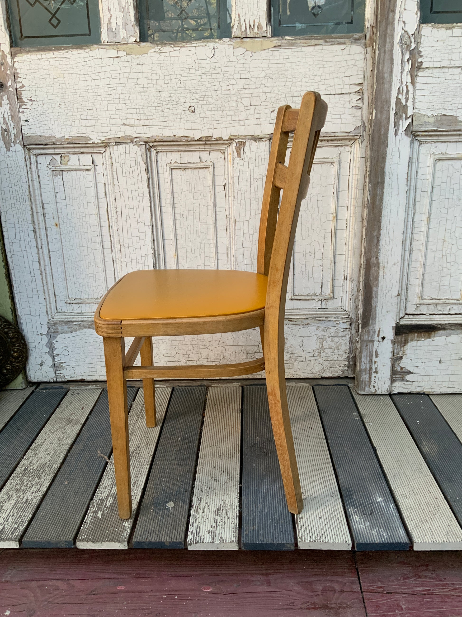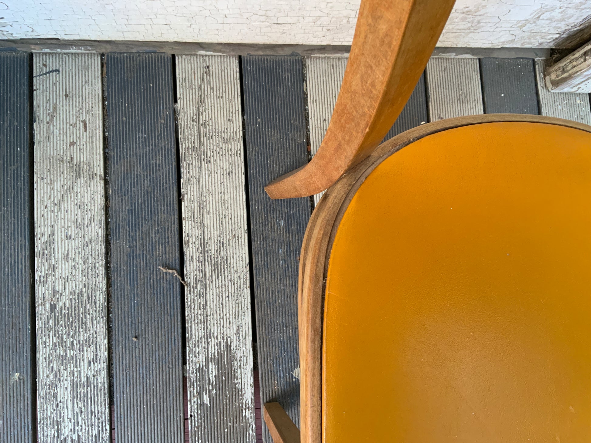 座面はフェイクレザーです、お色や控えめながらバランスの良いデザインで、レトロ感のある素敵なチェアー。お好きなファブリックでクッションを添えても♪