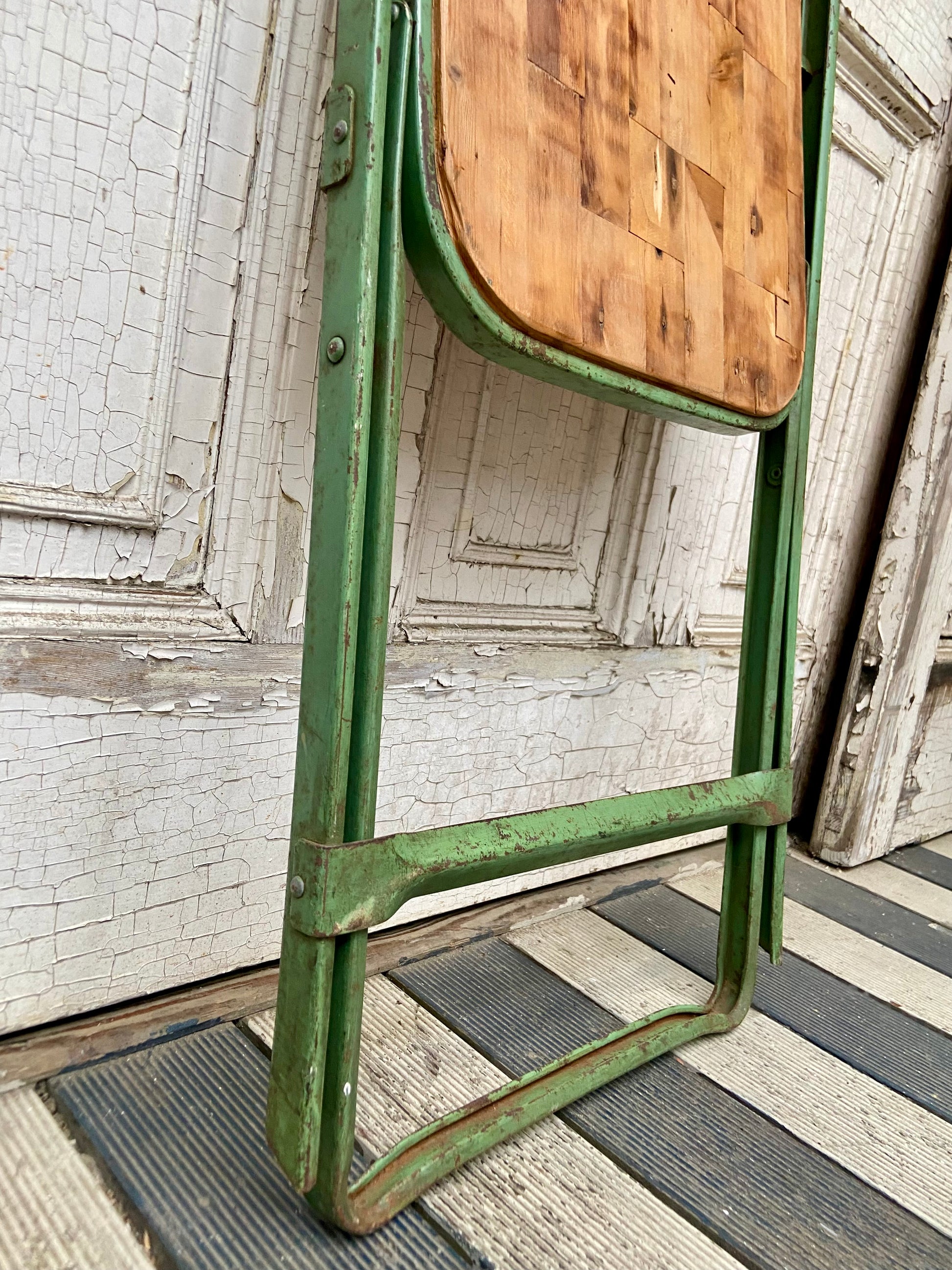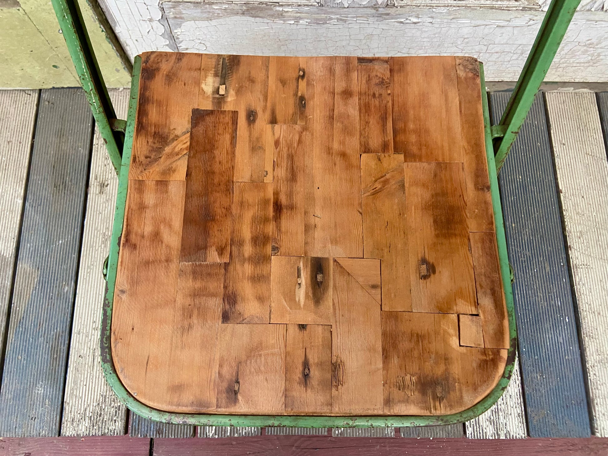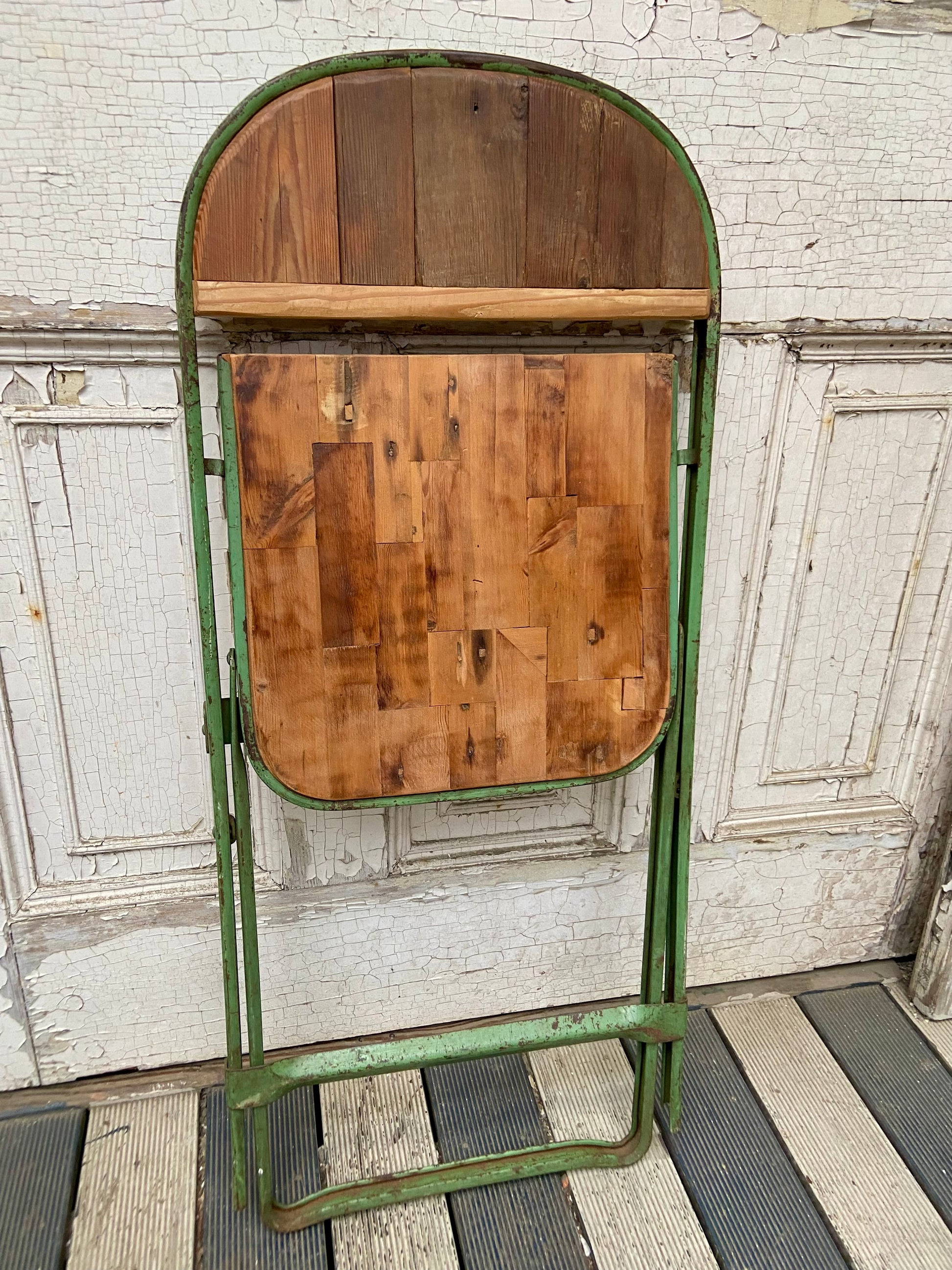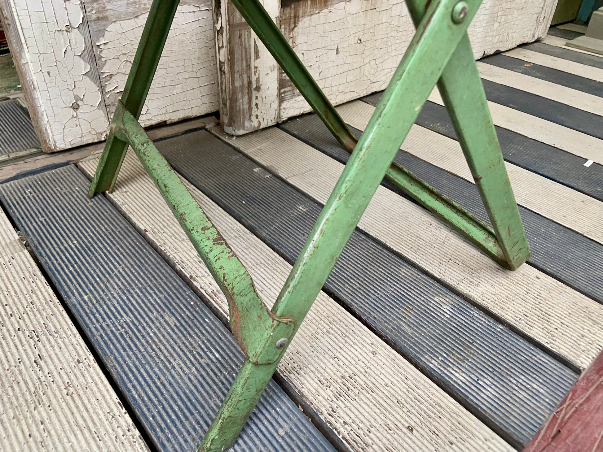 メタルフレームのfoldingchairに、オールドパイン材で寄木貼りにしました。