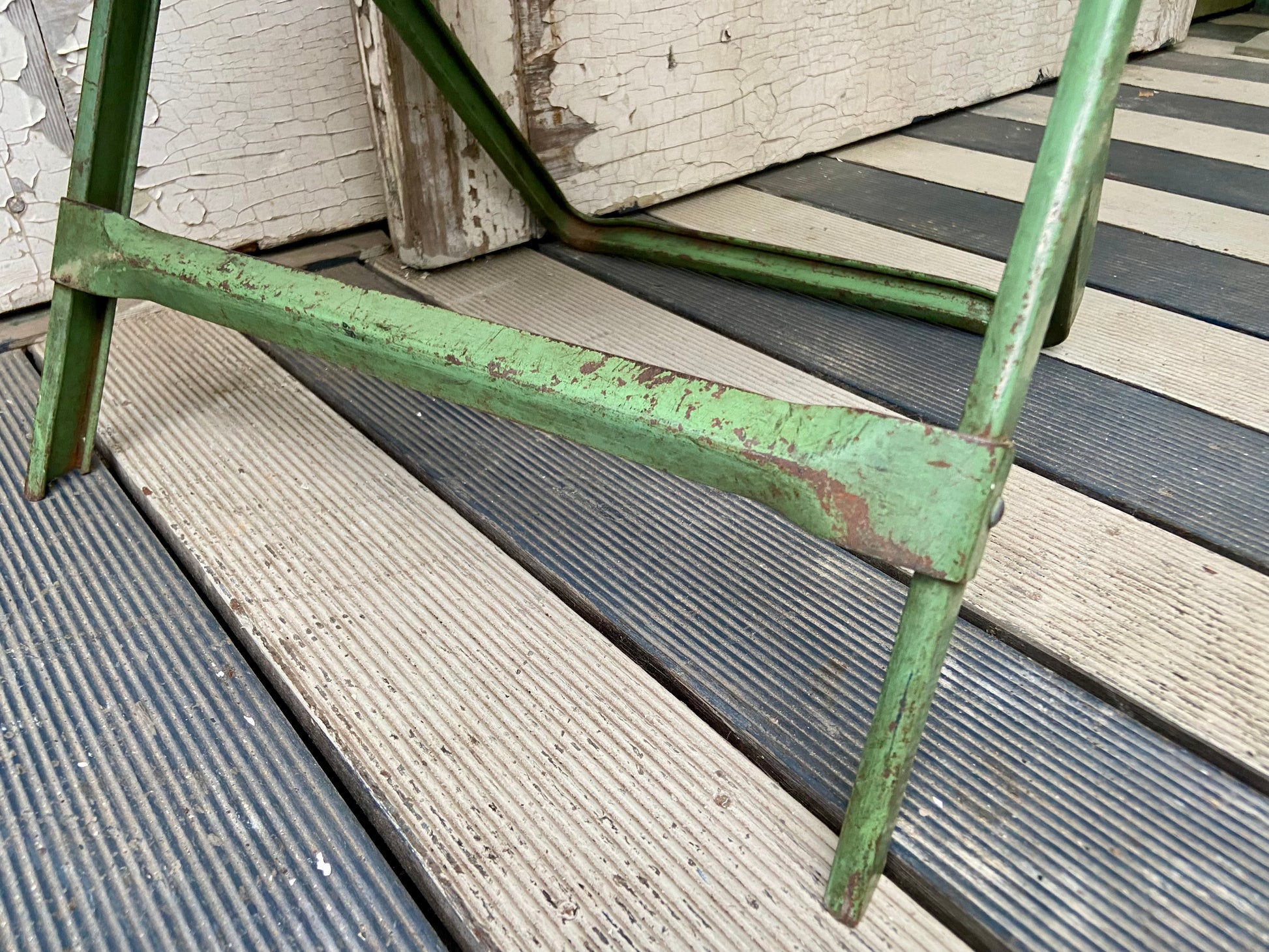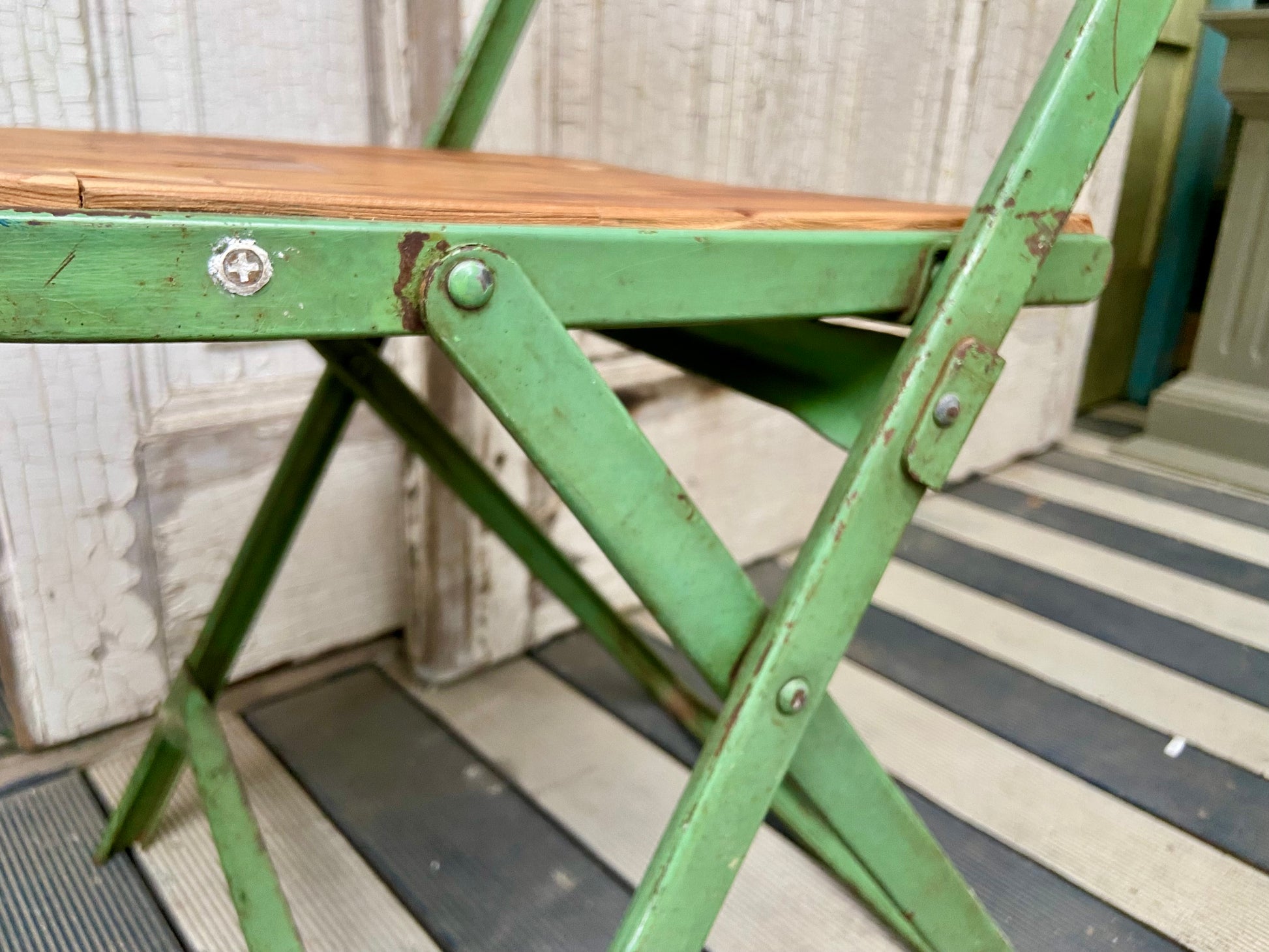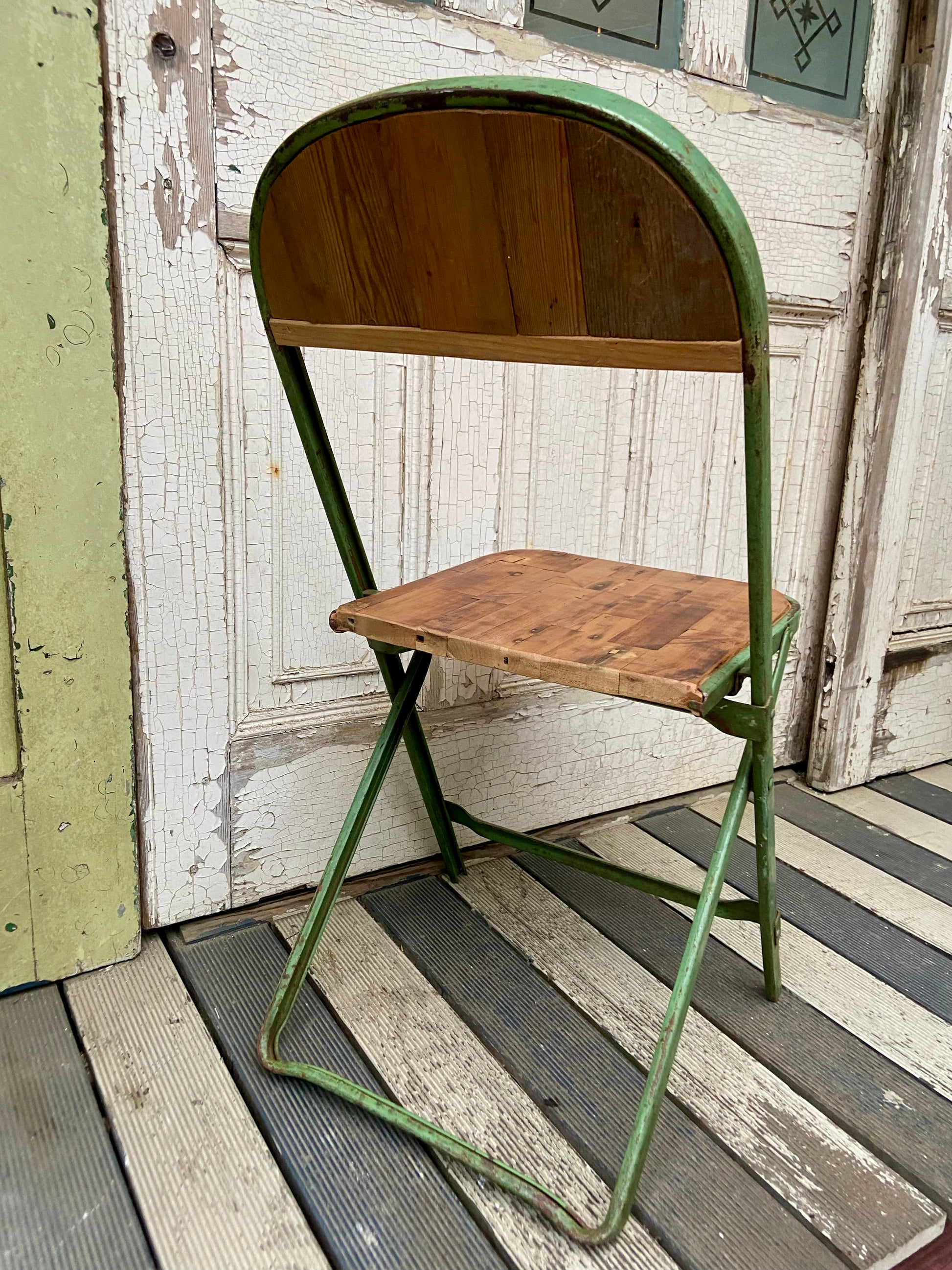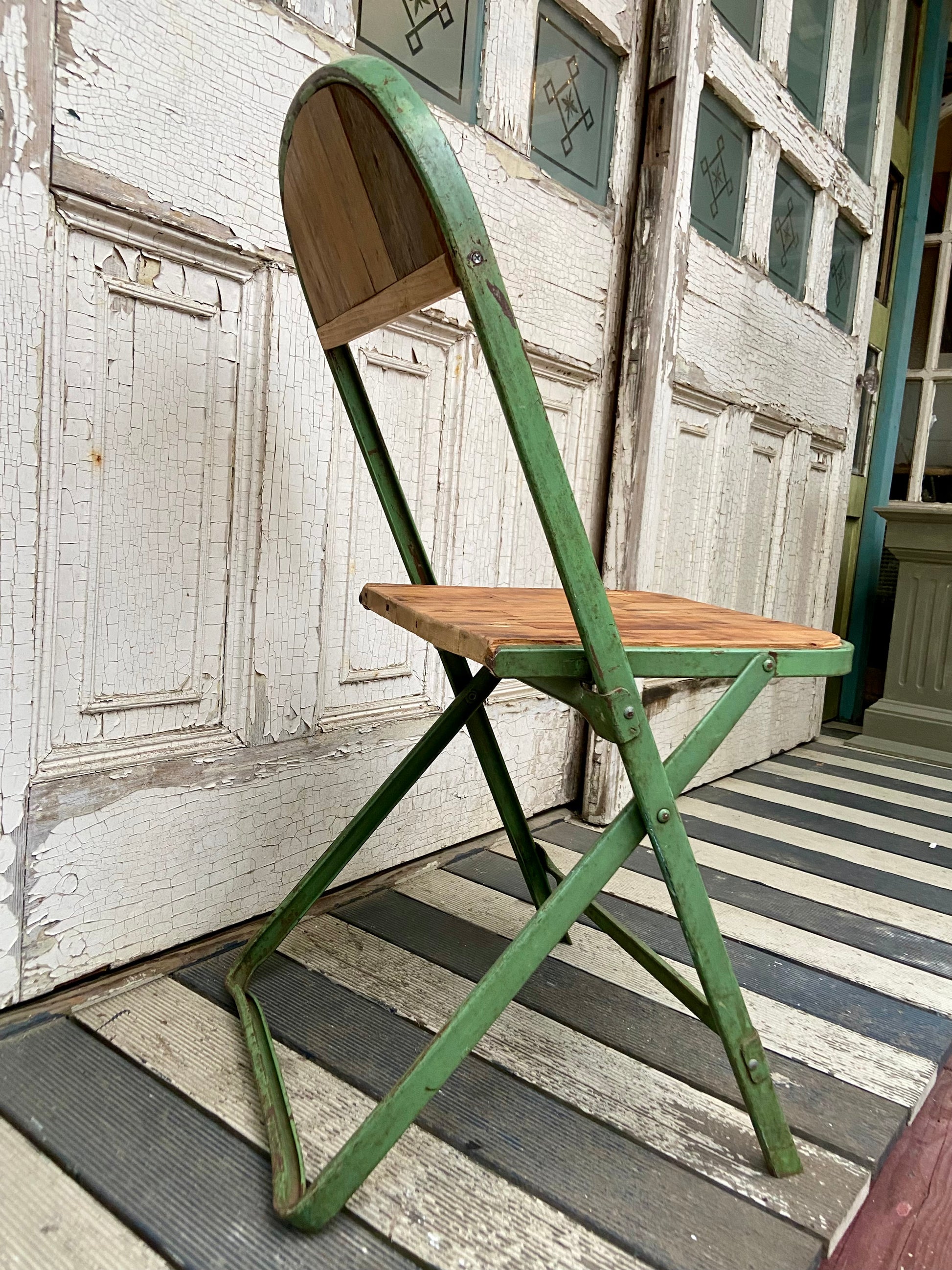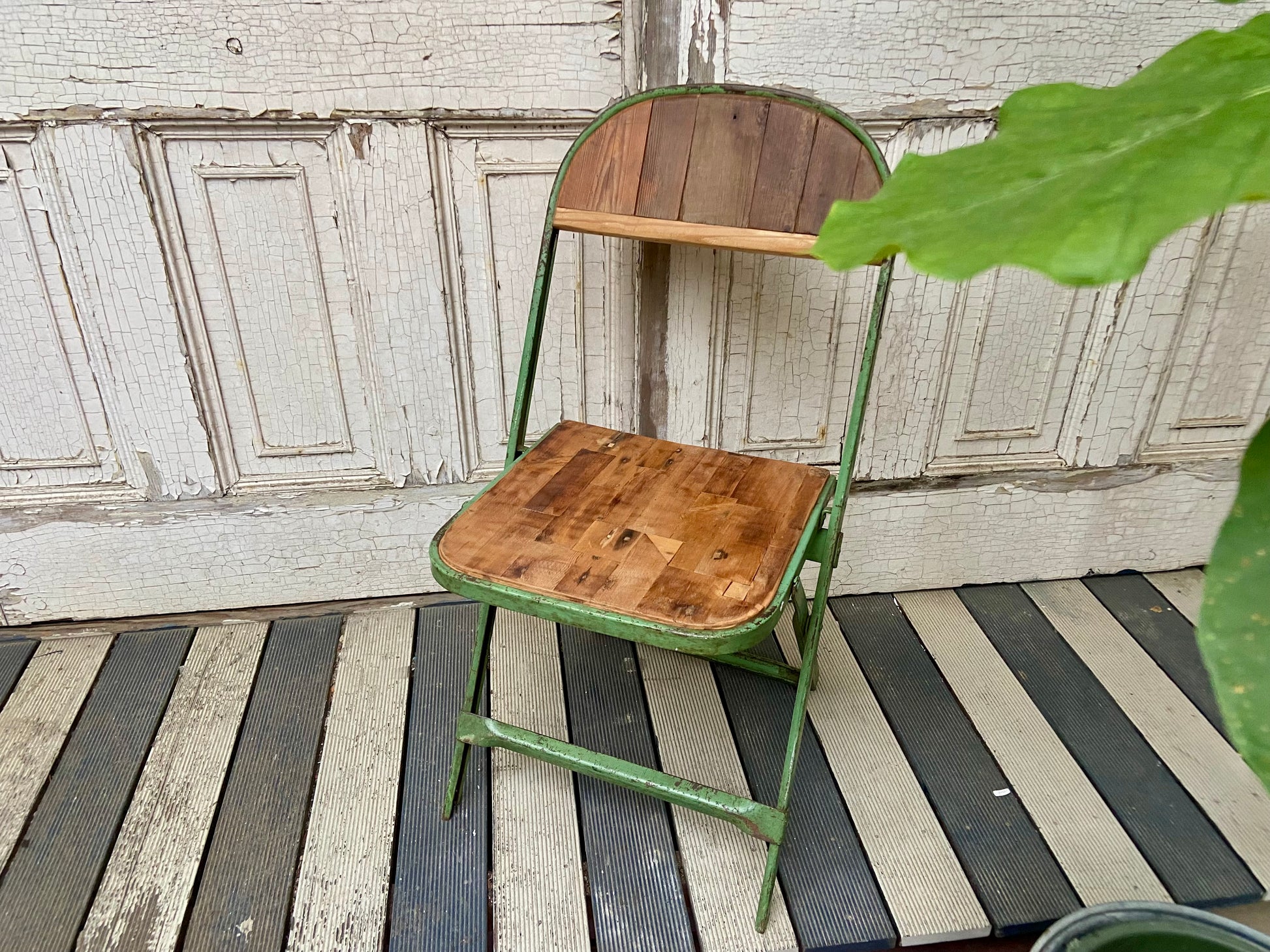 メタルフレームのfoldingchairに、オールドパイン材で寄木貼りにしました。