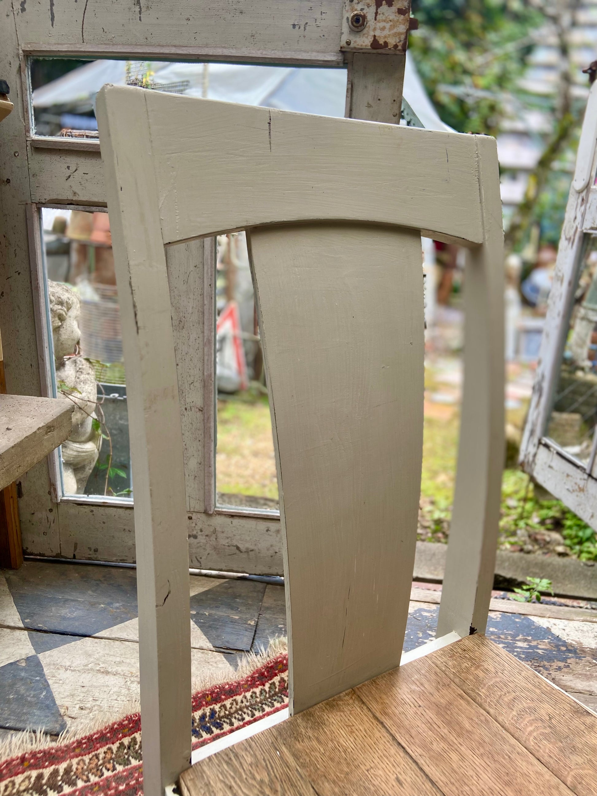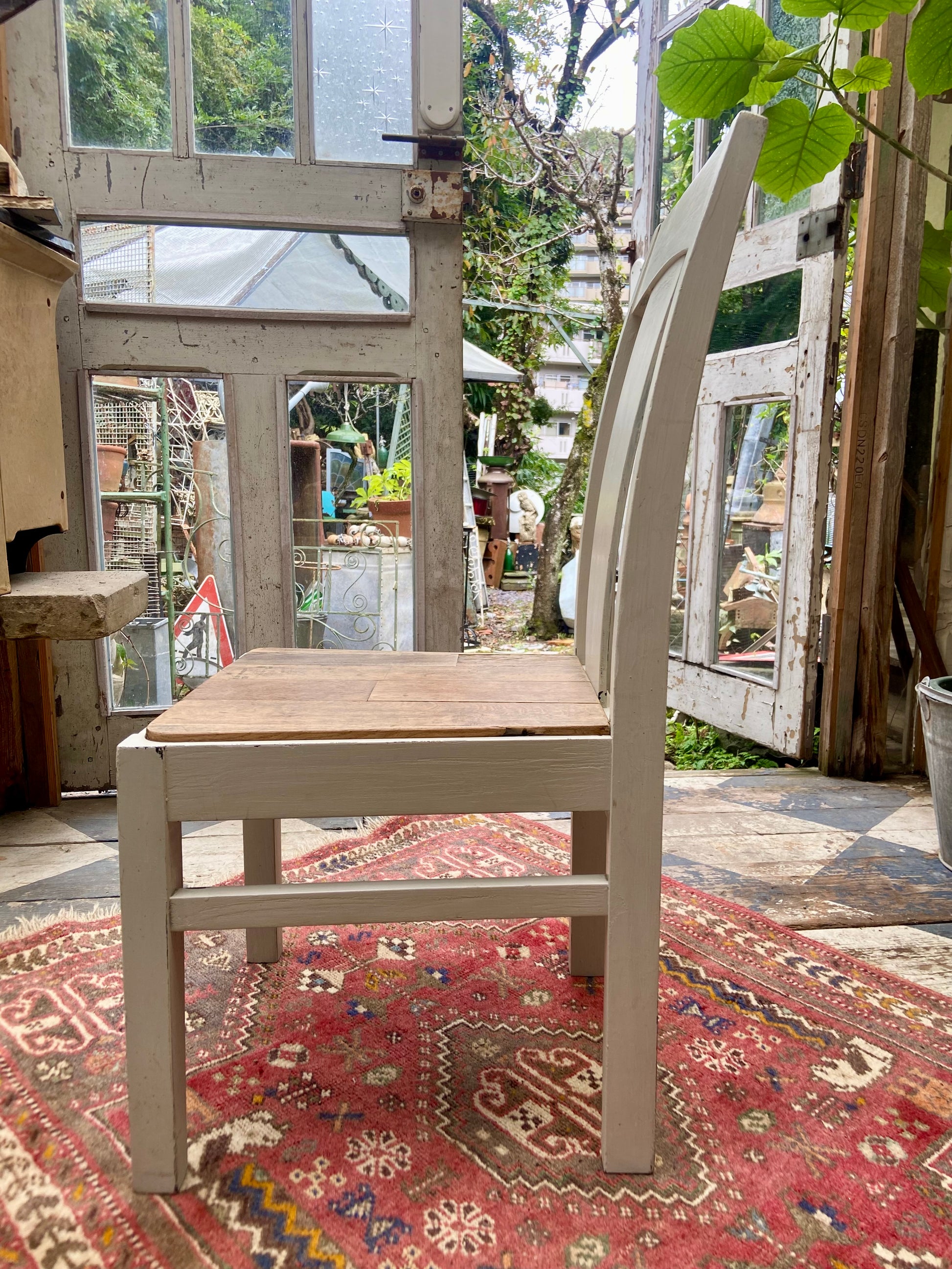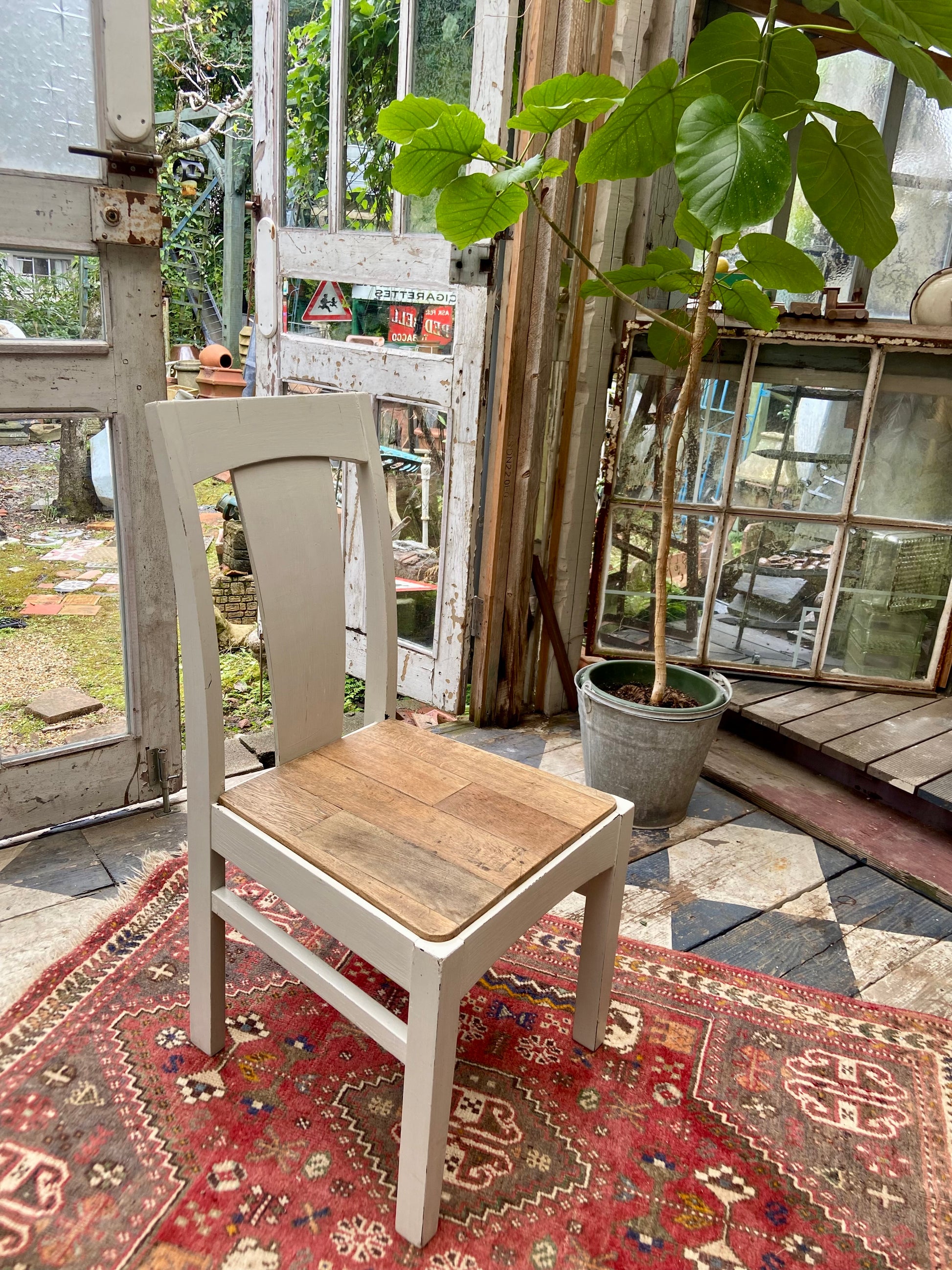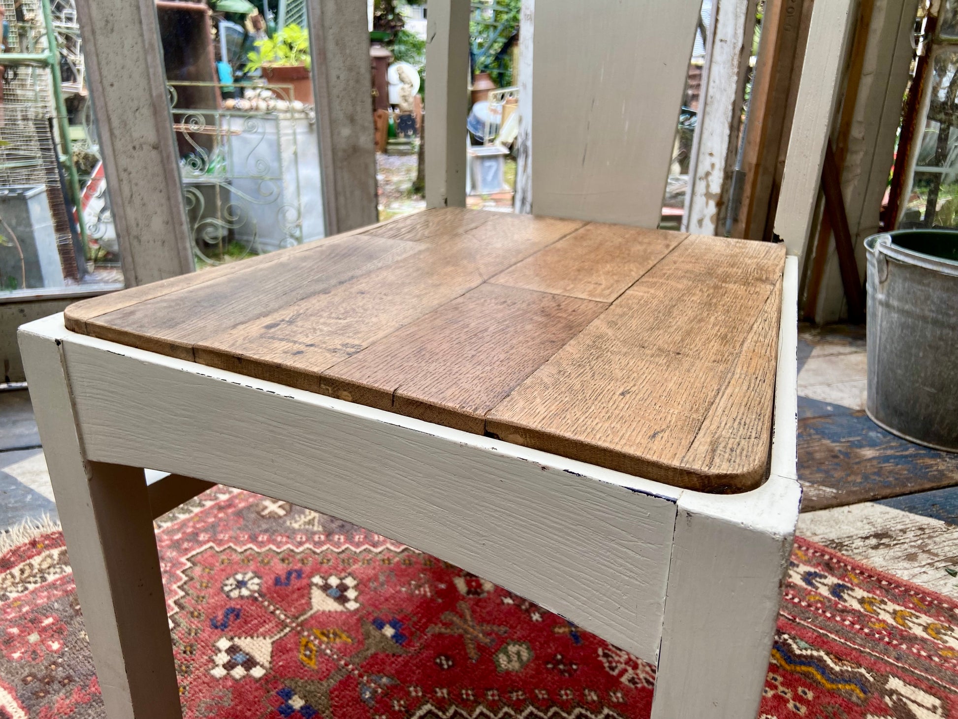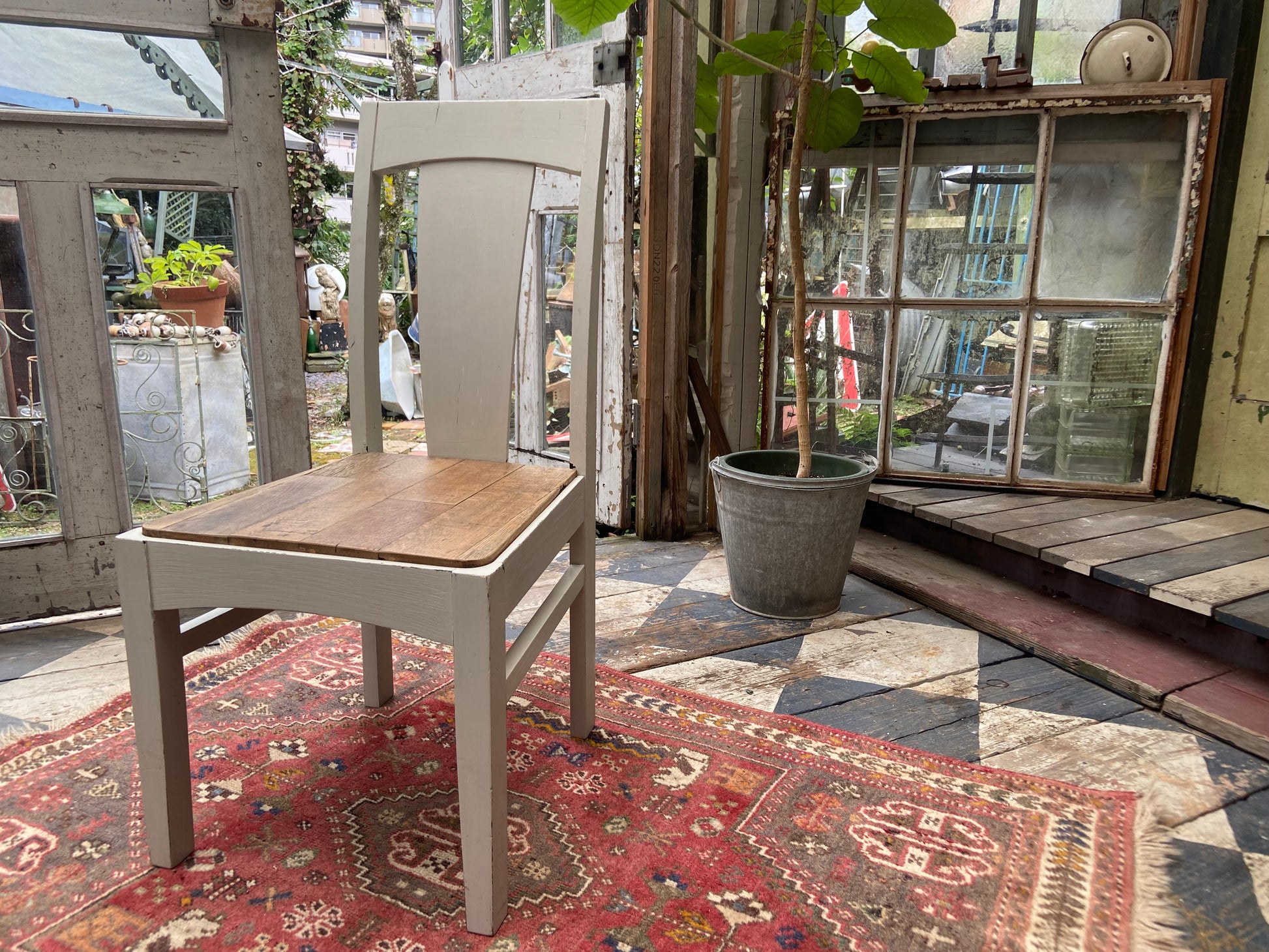 モダンデザインのフレームに座面を板に張り替えました。クリアな印象でどこか新鮮です。オールドイングリッシュオークの寄木。お色は落ち着いた少しくすみのあるアイボリー。