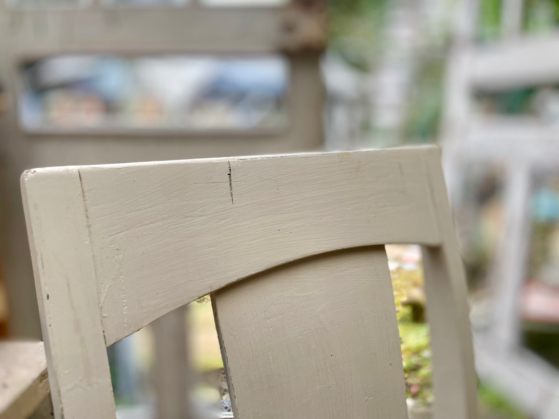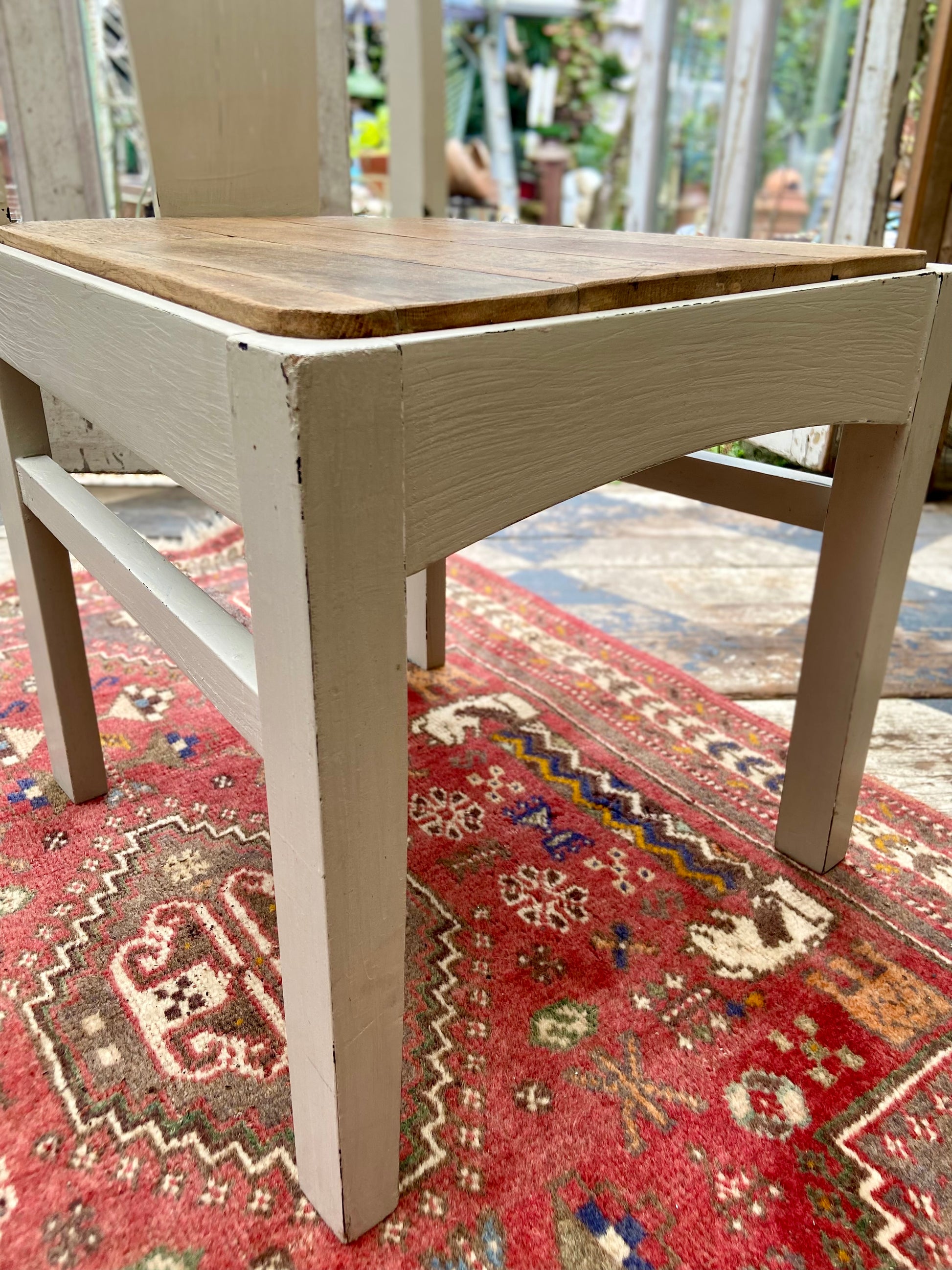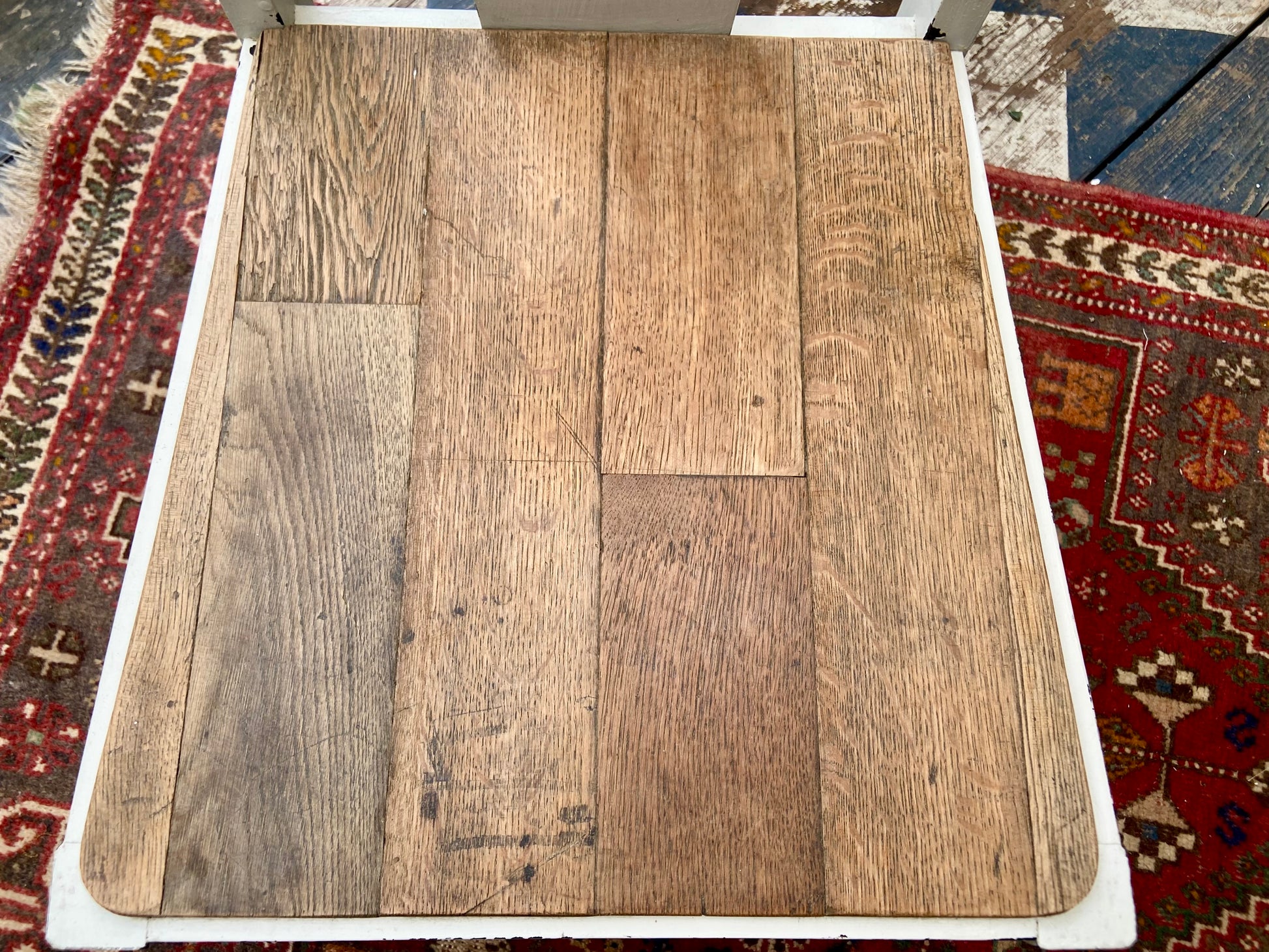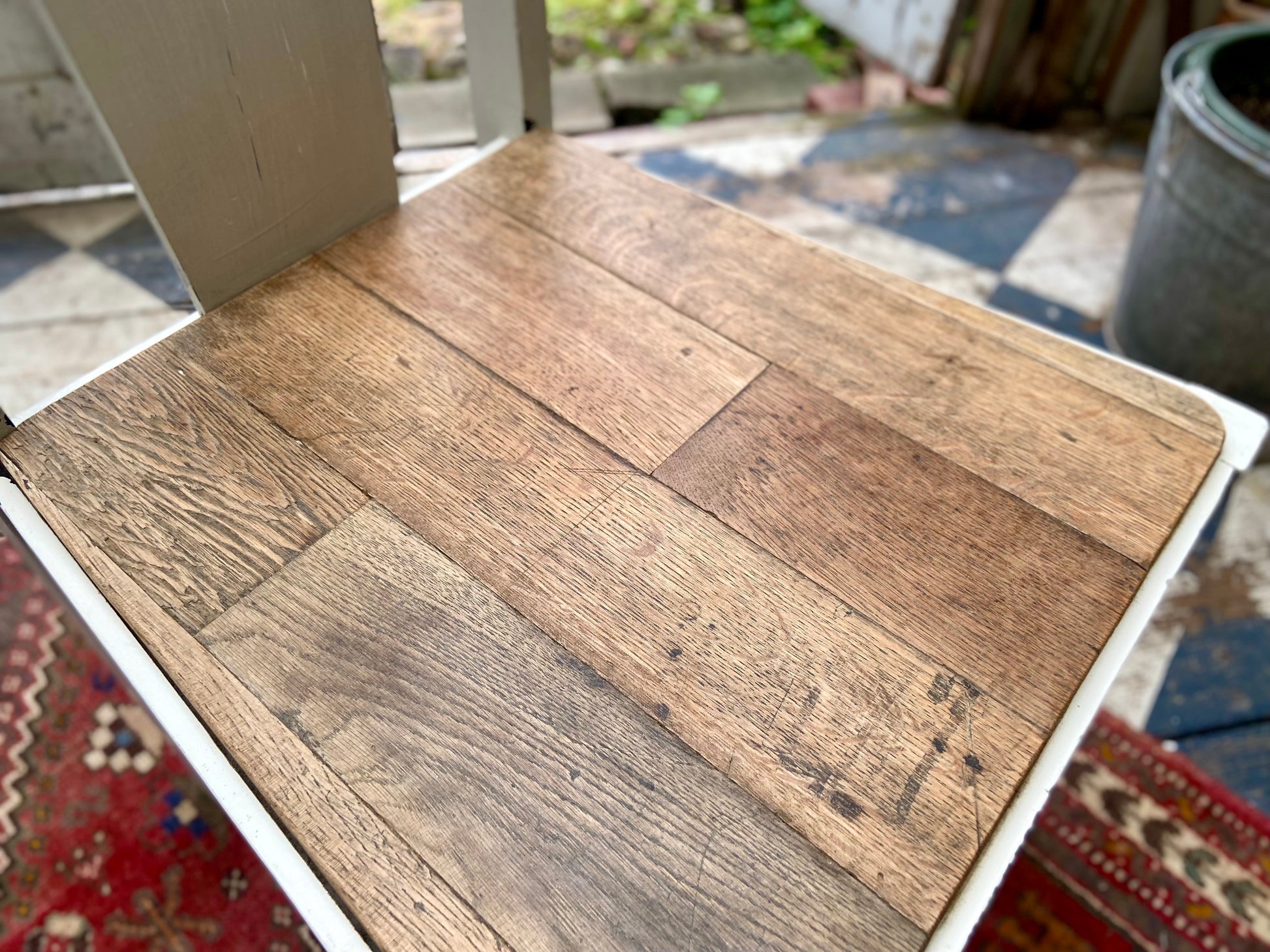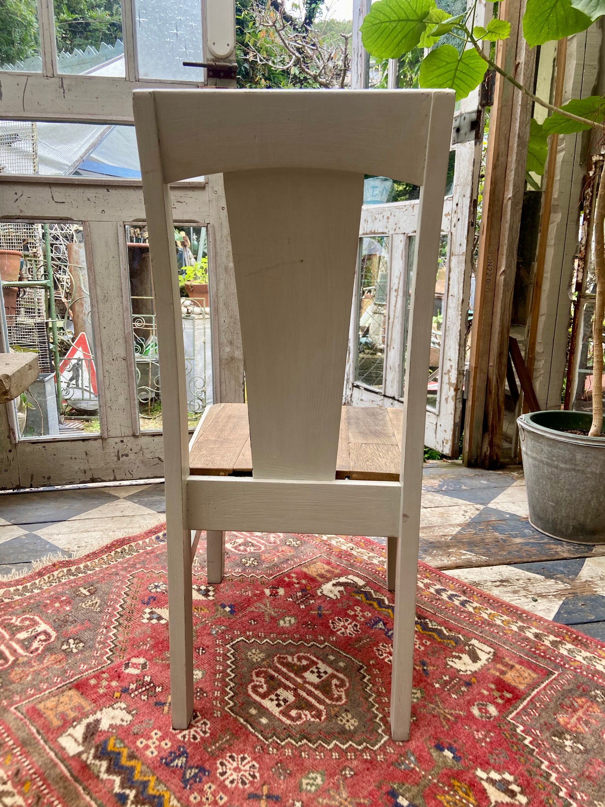 モダンデザインのフレームに座面を板に張り替えました。クリアな印象でどこか新鮮です。オールドイングリッシュオークの寄木。お色は落ち着いた少しくすみのあるアイボリー。