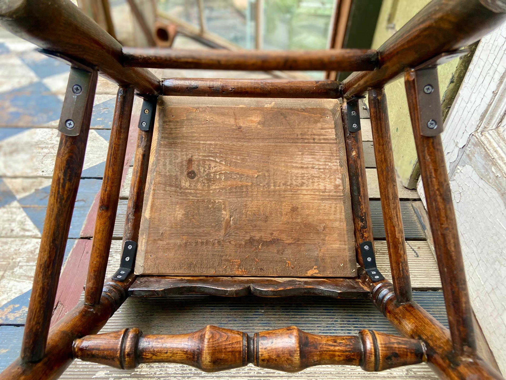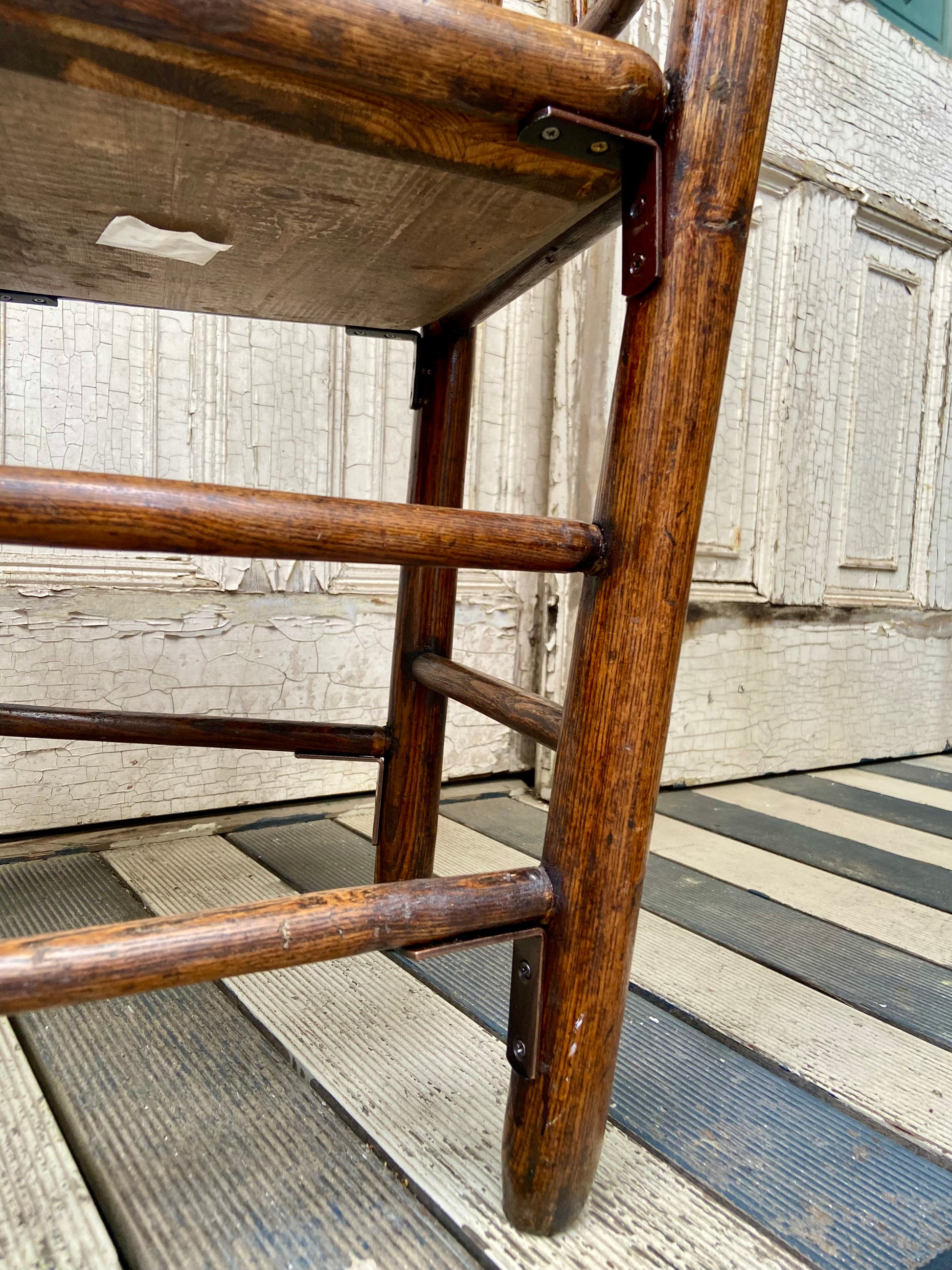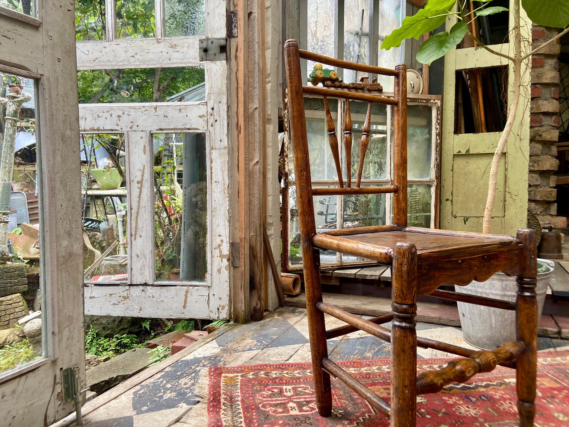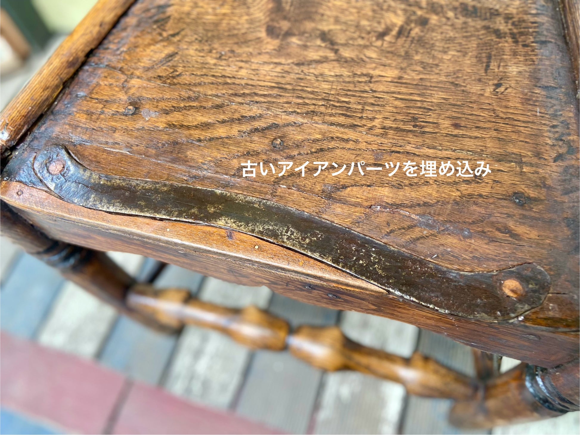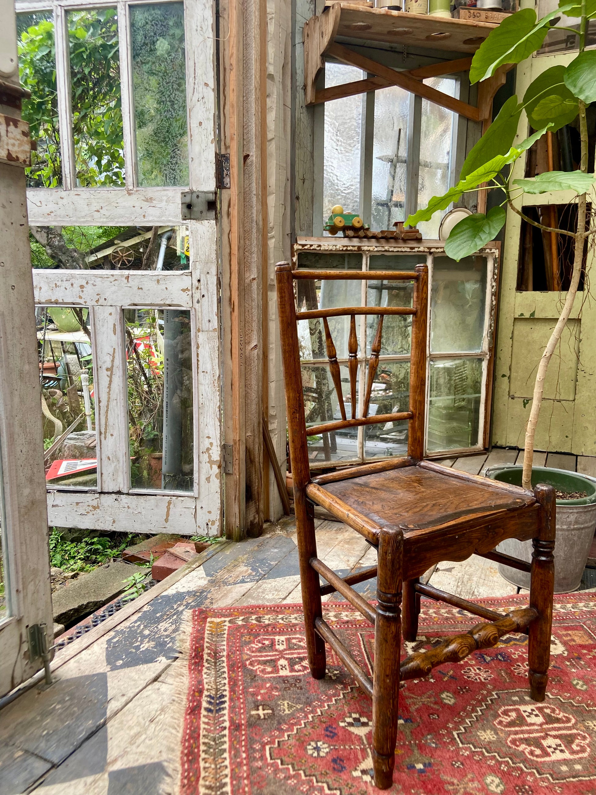 素朴だけれど挽物細工の背もたれや、当時のarts&craftsの流れを感じるデザインの美しさ、手仕事の温もりがしっかりと残るお椅子です。古い木の味わい、質感に存在感を感じます。アイアンパーツをはめ込み遊びをプラス。実用も可能ですが、サイドテーブルや花台などオブジェ感覚でお使いいただくことをお勧めします、お玄関先なんかにも♪