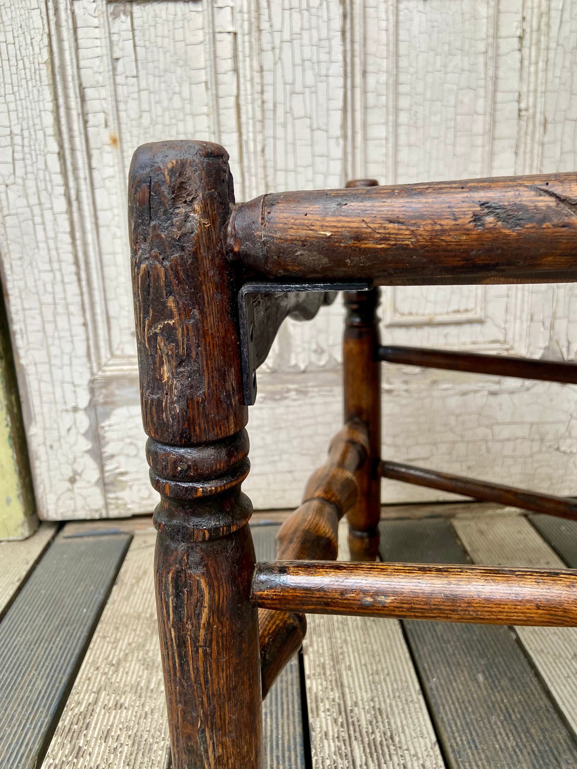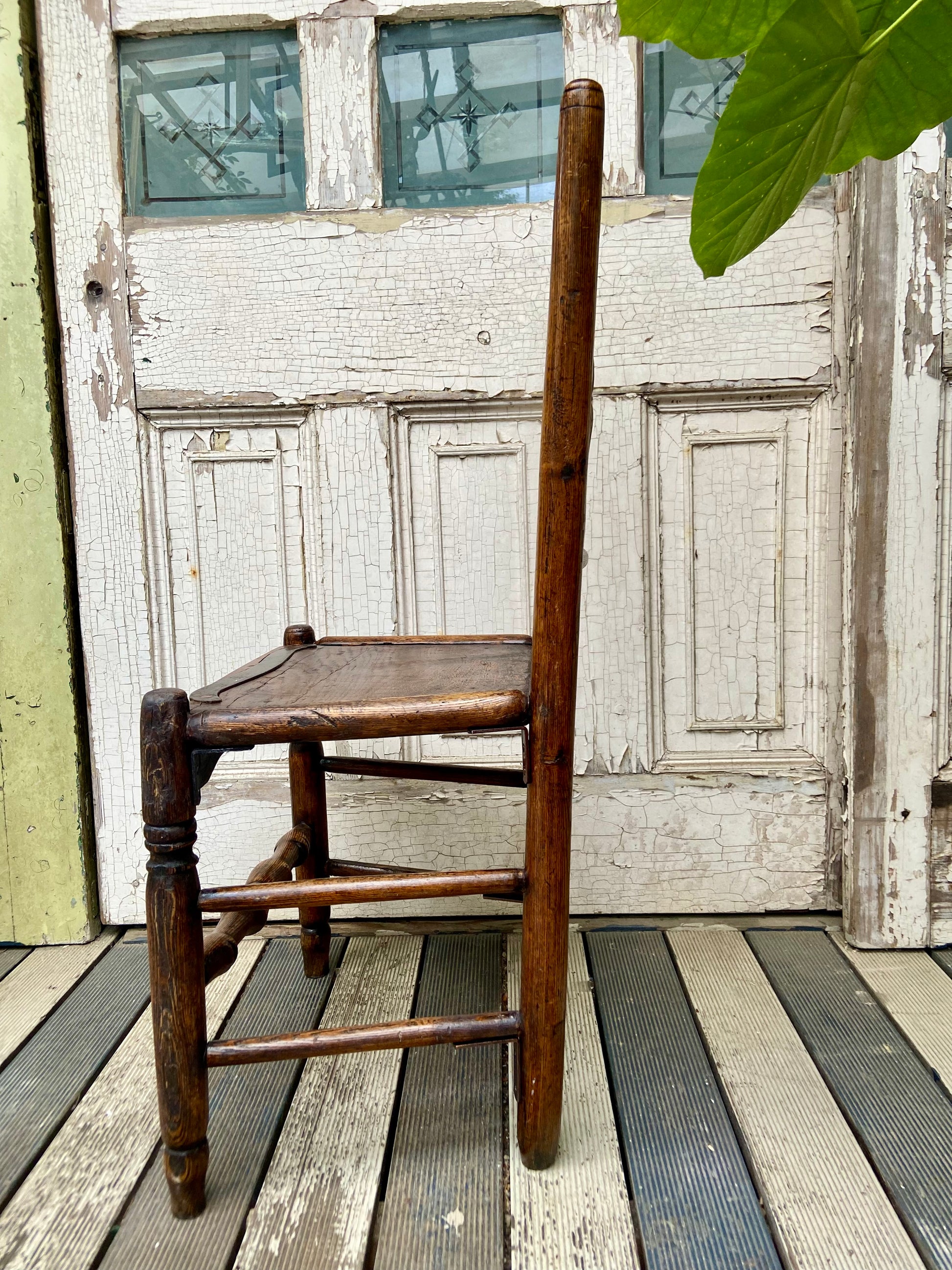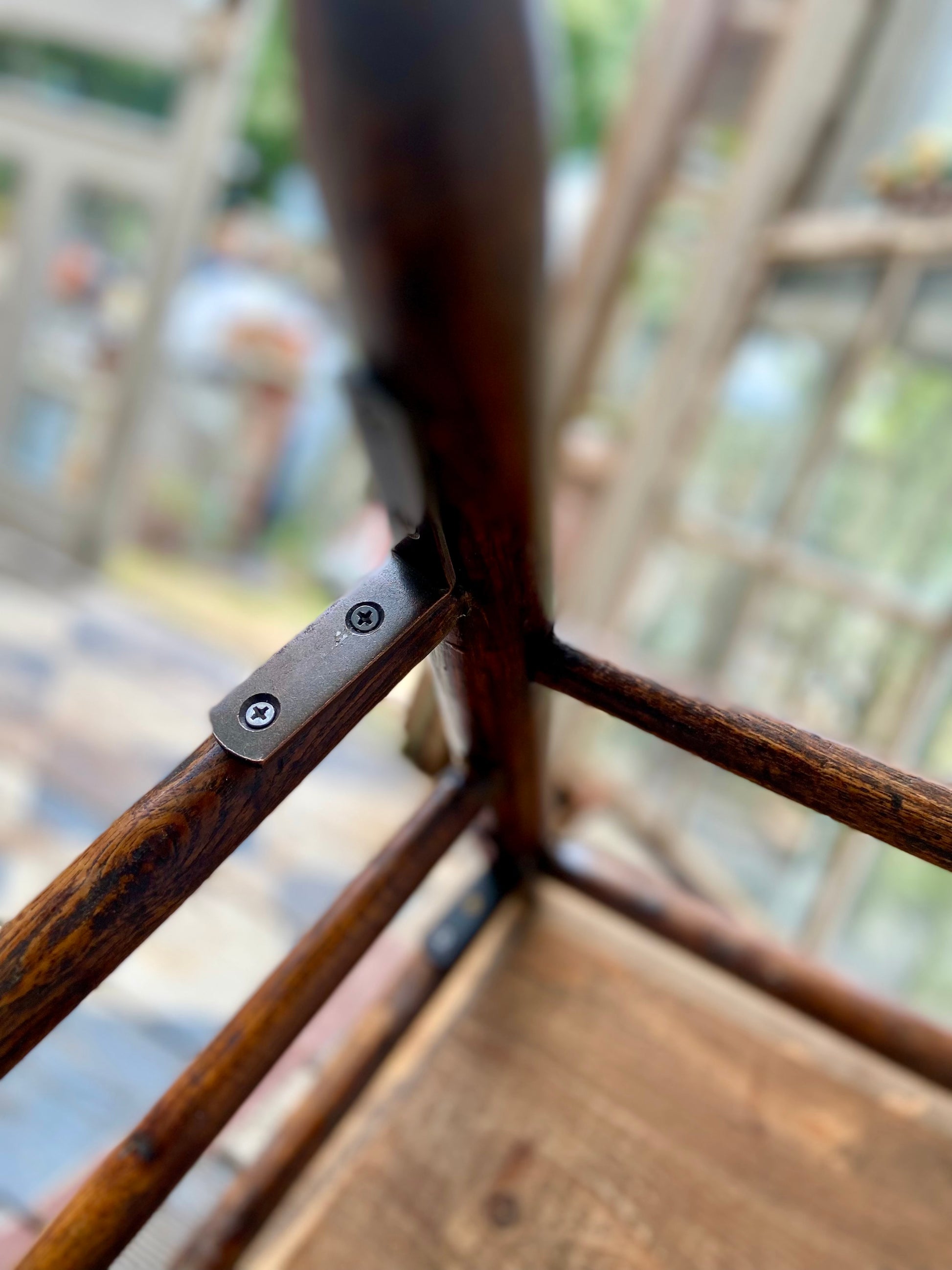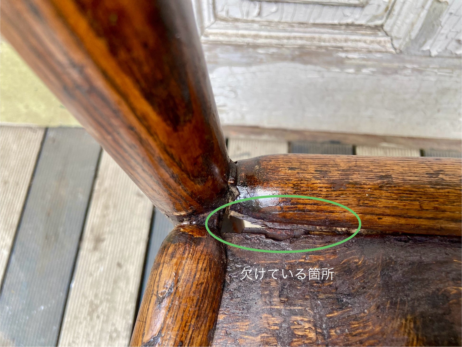 素朴だけれど挽物細工の背もたれや、当時のarts&craftsの流れを感じるデザインの美しさ、手仕事の温もりがしっかりと残るお椅子です。古い木の味わい、質感に存在感を感じます。アイアンパーツをはめ込み遊びをプラス。実用も可能ですが、サイドテーブルや花台などオブジェ感覚でお使いいただくことをお勧めします、お玄関先なんかにも♪