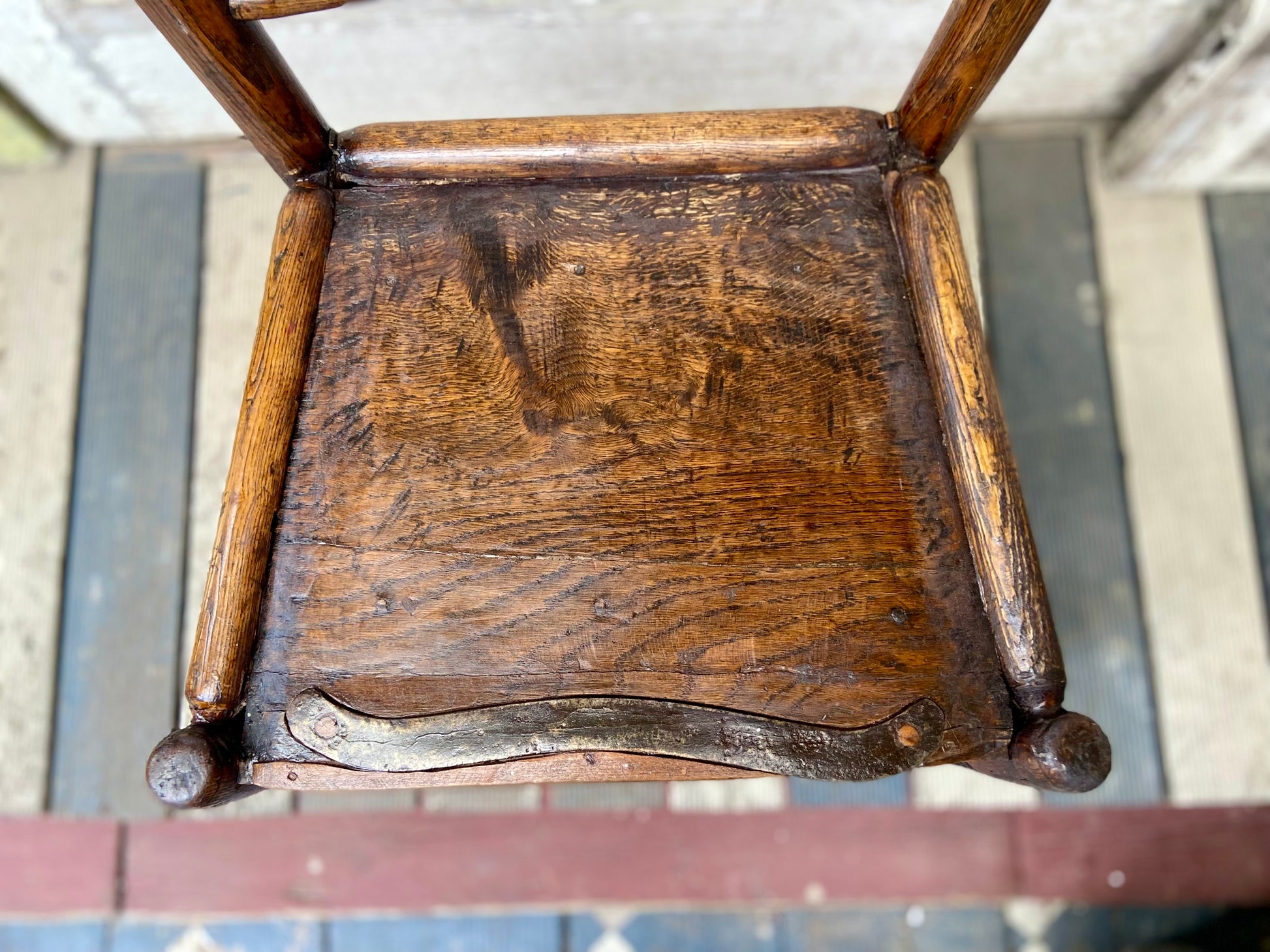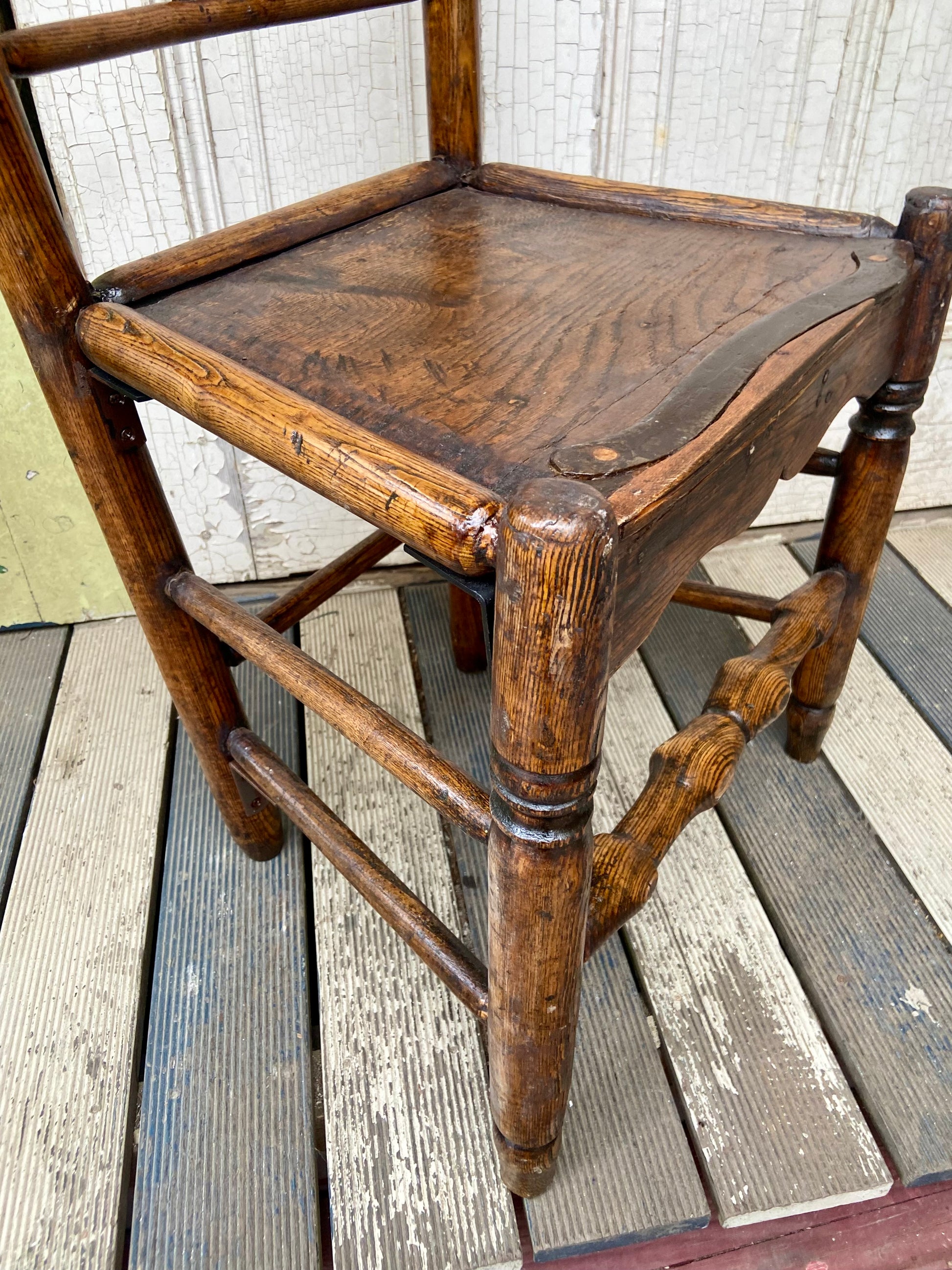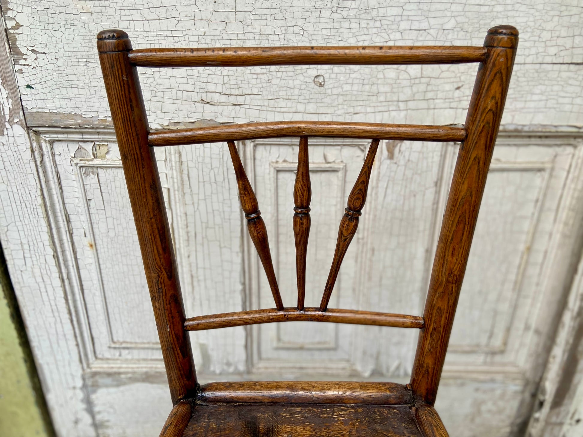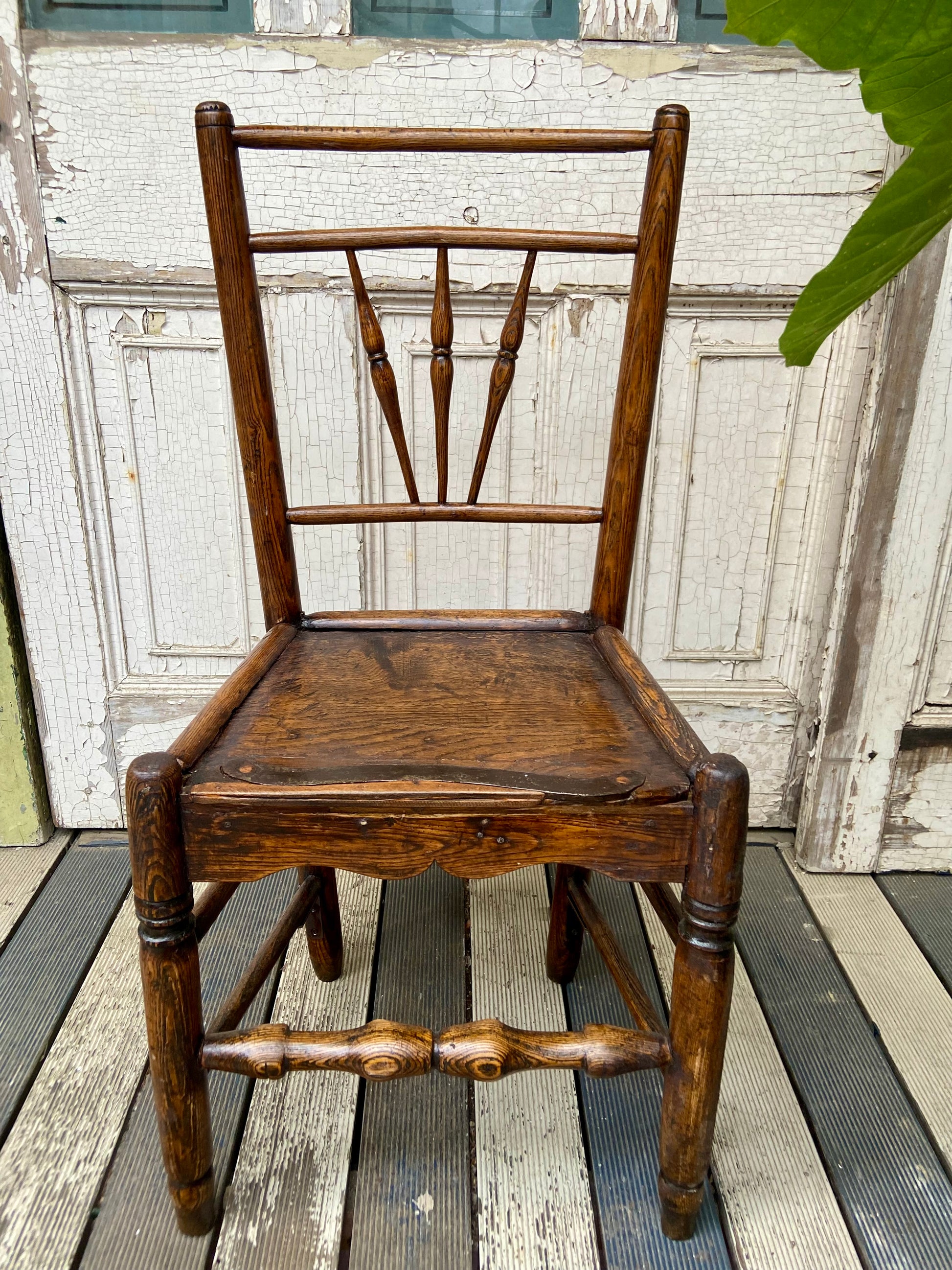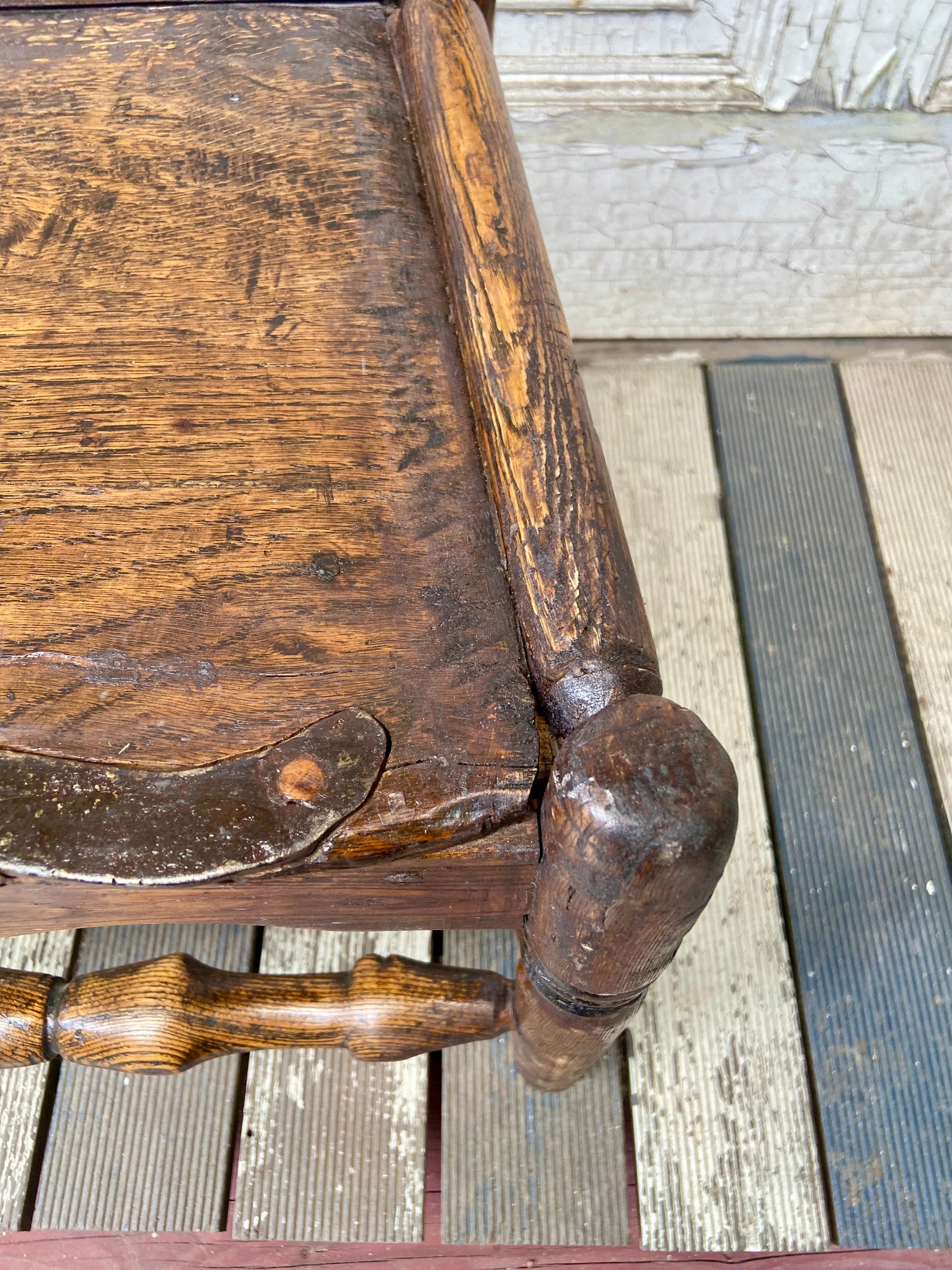 素朴だけれど挽物細工の背もたれや、当時のarts&craftsの流れを感じるデザインの美しさ、手仕事の温もりがしっかりと残るお椅子です。古い木の味わい、質感に存在感を感じます。アイアンパーツをはめ込み遊びをプラス。実用も可能ですが、サイドテーブルや花台などオブジェ感覚でお使いいただくことをお勧めします、お玄関先なんかにも♪