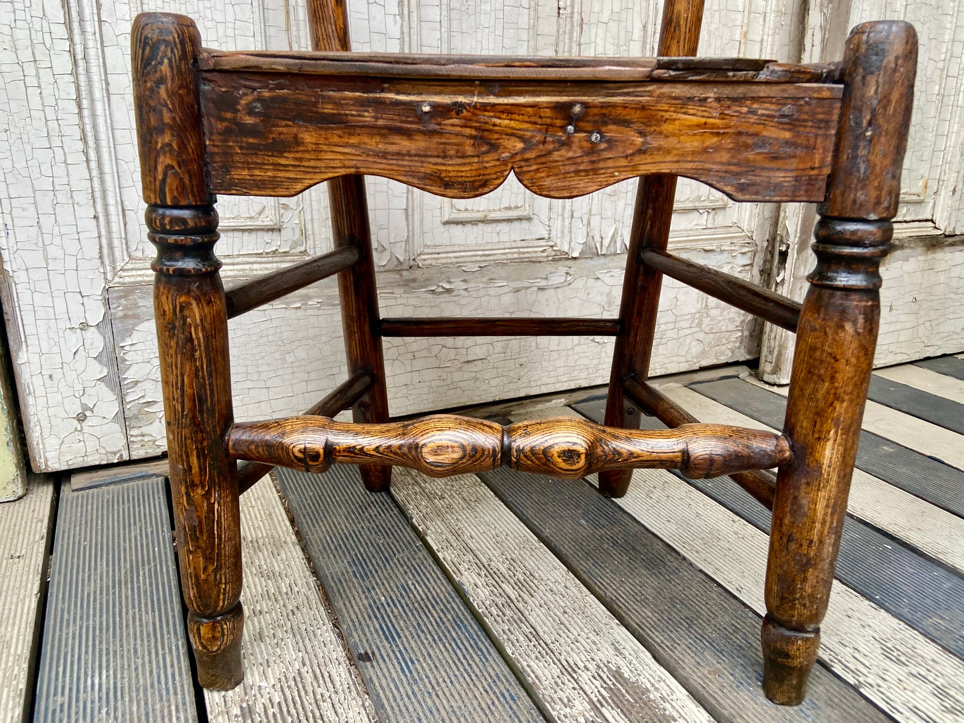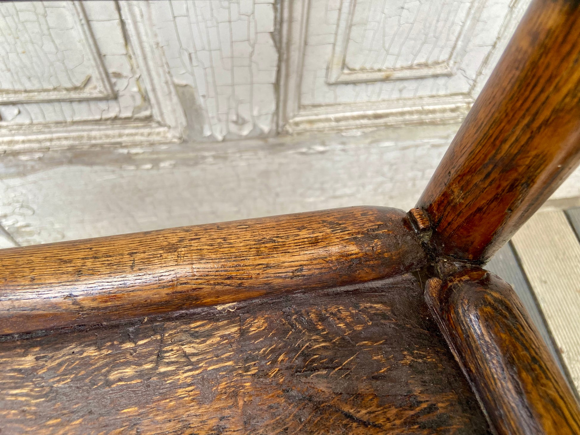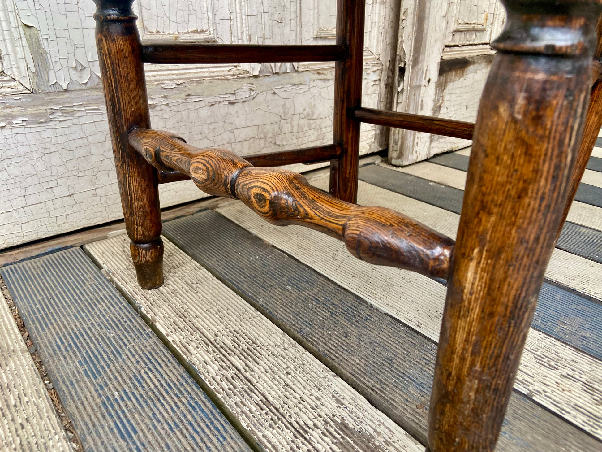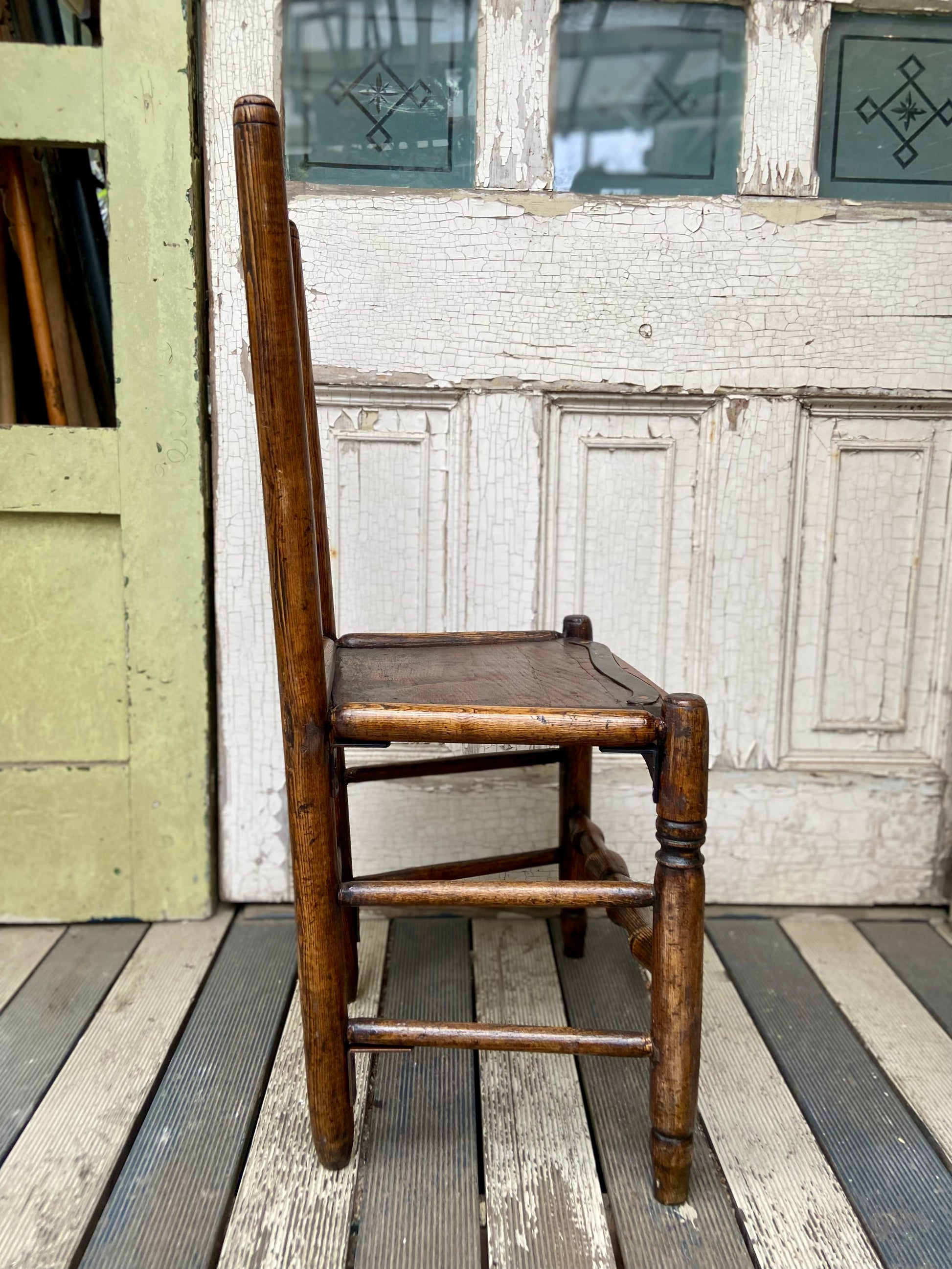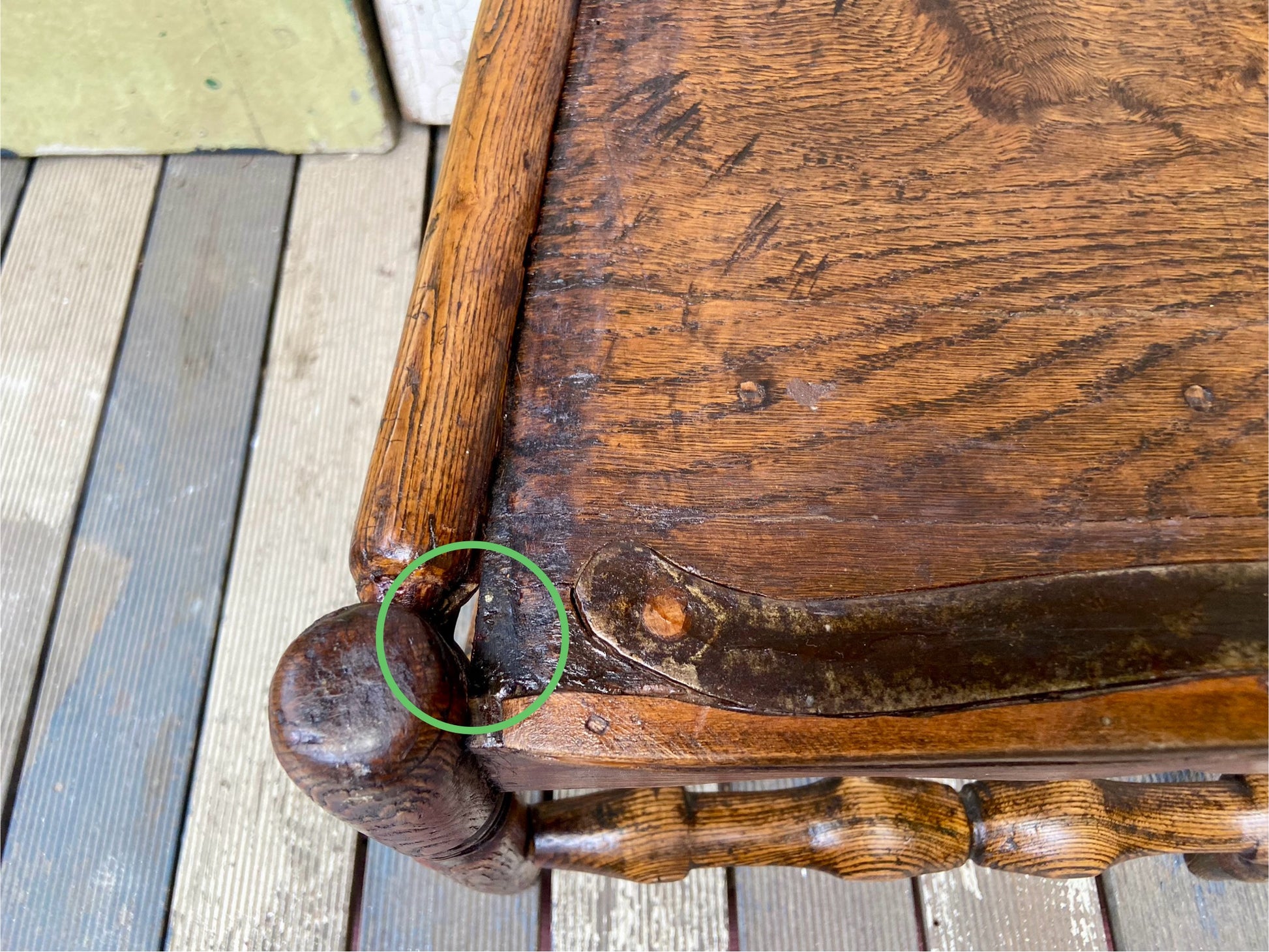 素朴だけれど挽物細工の背もたれや、当時のarts&craftsの流れを感じるデザインの美しさ、手仕事の温もりがしっかりと残るお椅子です。古い木の味わい、質感に存在感を感じます。アイアンパーツをはめ込み遊びをプラス。実用も可能ですが、サイドテーブルや花台などオブジェ感覚でお使いいただくことをお勧めします、お玄関先なんかにも♪